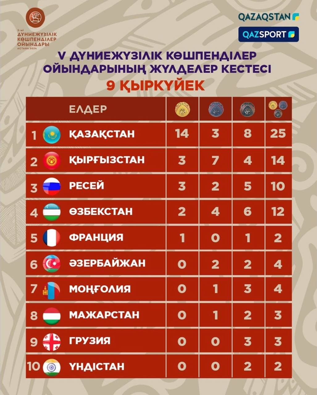 Қазақстан ұлттық құрамасы Дүниежүзілік көшпенділер ойындарының екінші жарыс күнін 14 алтын, 3 күміс, 8 қола медальмен аяқтады, деп хабарлады Orda.kz.