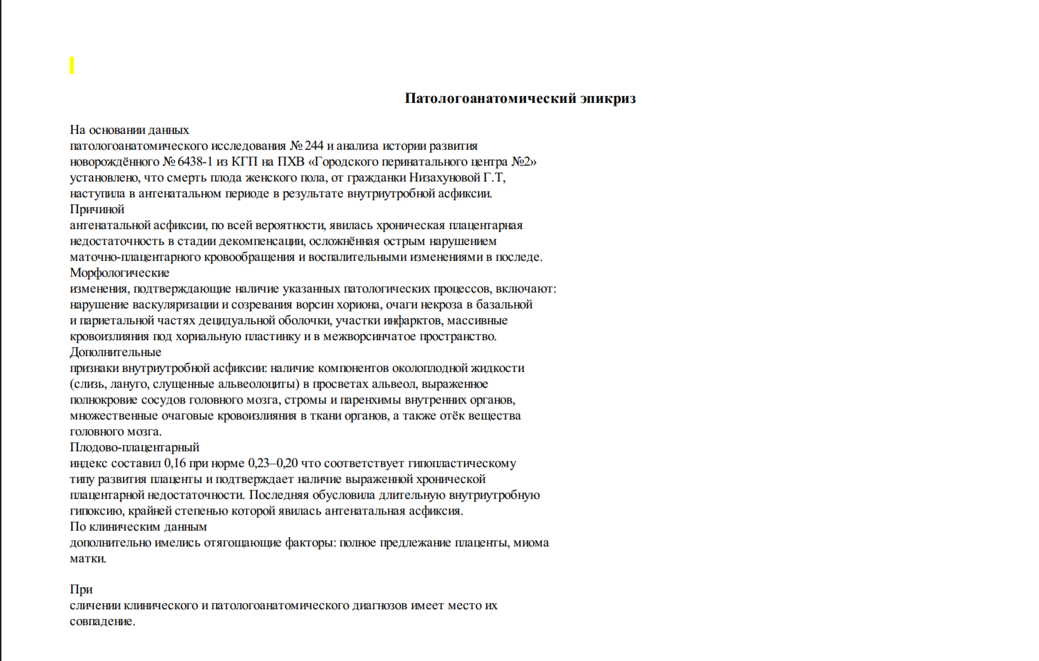 «Низахунова Г.Т.-ның ішіндегі қыз баланың өлімі туғанға дейін болған. Себебі — ұрыққа оттегі дұрыс бармаған (яғни асфиксия). Дәрігерлердің айтуынша, оттегінің жетпей қалуына ең ықтимал себеп — плацентаның дұрыс жұмыс істемеуі, оның созылмалы әрі ауыр (декомпенсацияланған) жеткіліксіздігі», — деп жазылған бала шетінегеннен кейінгі медициналық тексерістің берген экспертизасының жауабында.