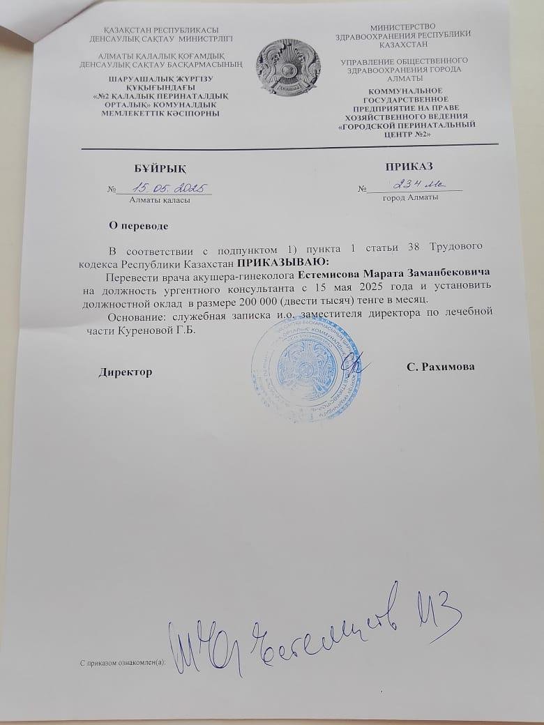 Алматы қаласындағы №2 перзентханада Гүлминям Низахунова есімді қала тұрғанының жаңа туылған сәбиі шетінеп кетіп, анасы оның себебі дәрігерлердің салғырттығы деп редакциямызға сұхбат берген болатын. Біздің жазған мақаламыздан кейін сол перзентханада акушер-гинеколог болып қызмет істеп жүрген Марат Естемісов редакциямызға хабарласты.