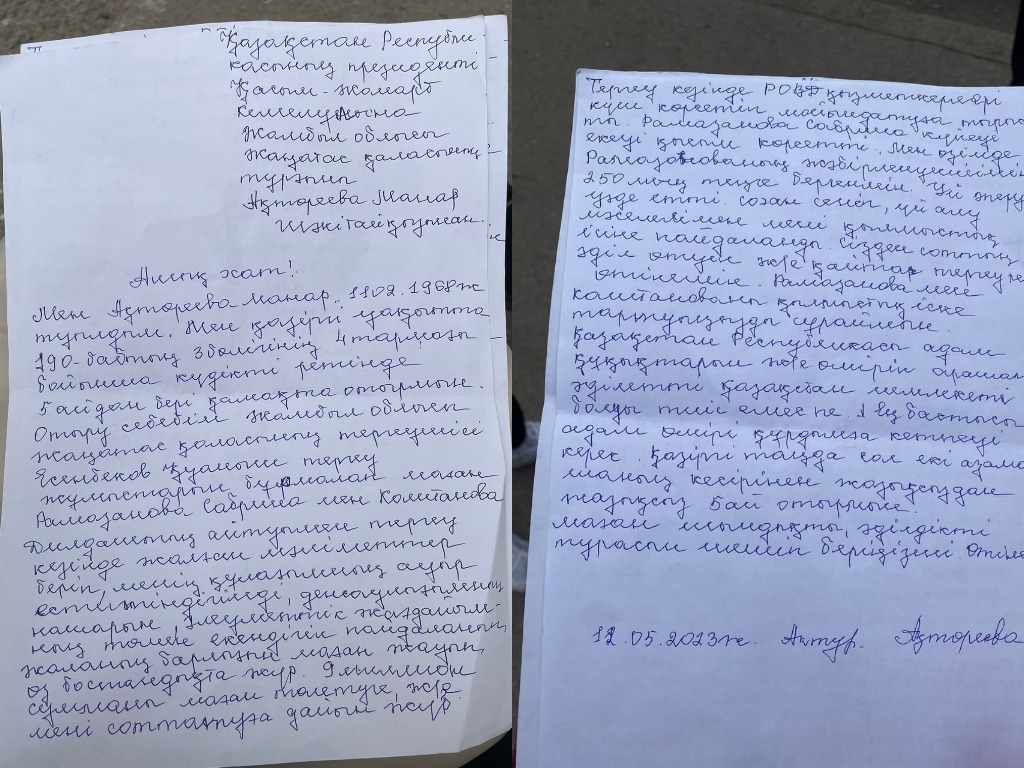 «Қазақстан Республикасының президенті Қасым-Жомарт Кемелұлына! Жамбыл облысы Жаңатас қаласының тұрғыны Ақтөреева Манар Шәкітайқызынан ашық Хат! Мен Ақтөреева Манар. 11.02.1968 ж туылдым. Мен қазіргі уақытта 190-бабтың 3 бөлімінің 4 тармағы бойынша күдікті ретінде 5 айдан бері қамақта отырмын. Себебі Жамбыл облысы Жаңатас қаласының тергеушісі Есенбеков Қуаныш тергеу жұмыстарын бұрмалап маған Рамазанова Сабрина мен Каштанова Ділдәштың айтуымен тергеу кезінде жалған мәліметтер беріп, менің құлағымның ауыр еститіндігін, денсаулығымның нашарын, әлеуметтік жағдайымның төмен екендігін пайдаланып, жаланың барлығын маған жауып, өздері бостандықта жүр. 9 миллионды маған төлетуге және мені соттауға дайын. Тергеу кезінде РОВД қызметкерлері күш көрсетіп мойындатуға тырысты. Рамазанова Сабрина күйеуі екеуі қысым көрсетті. Мен өзім де Рамазанованың жәбірленушісімін 250 мың теңге бергенмін. Үй әперуге уәде етті. Соған сеніп, үй алу мәселесімен мені қылмыстық ісіне пайдаланды. Сізден соттың әділ өтуін және қайта тергелуін өтінемін. Рамазанова мен Каштанованы қылмыстық іске тартуыңызды сұраймын. Қазақстан Республикасы адам құқықтарын және өмірін арашалап әділетті Қазақстан мемлекеті болуы тиіс емес пе?! Ең бастысы адам өмірі құрдымға кетпеуі керек. Қазіргі таңда сол екі азаматшаның кесірінен жазықсыздан жазықсыз 5 ай отырмын. Маған шындықты, әділдікті шешіп беріңізші. Өтінемін» деп жазылған ашық хатта.