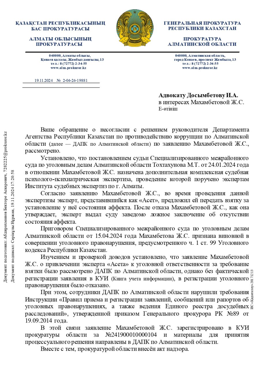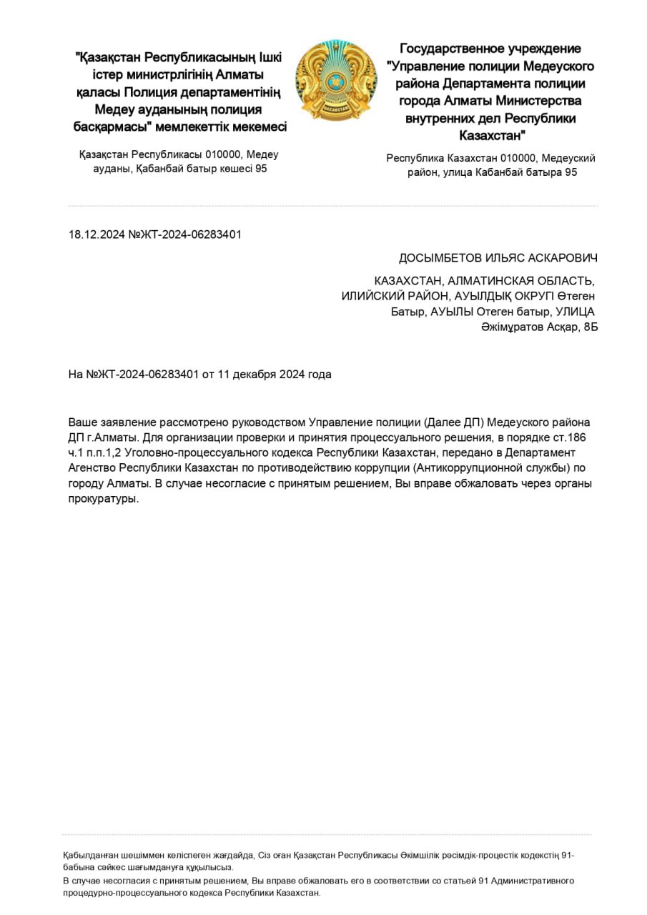 «Сыбайлас жемқорлыққа қарсы күрес агенттігі бұл істі Алматы қаласы бойынша полиция департаментіне тапсырсын. Қабылданған шешіммен келіспеген жағдайда уәкілетті органдар арқылы шағымдануға құқығыңыз бар», деп жауап берді прокуратура.