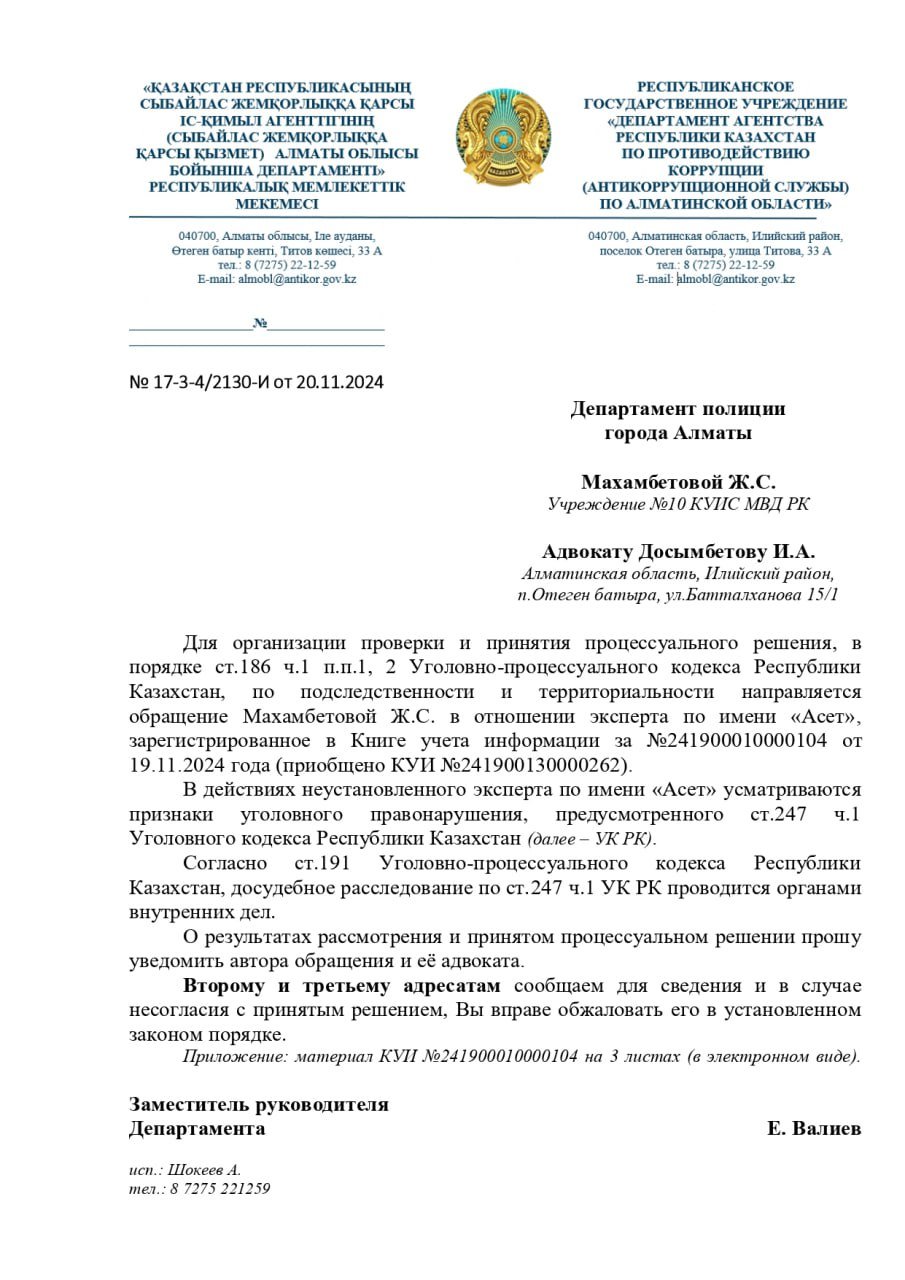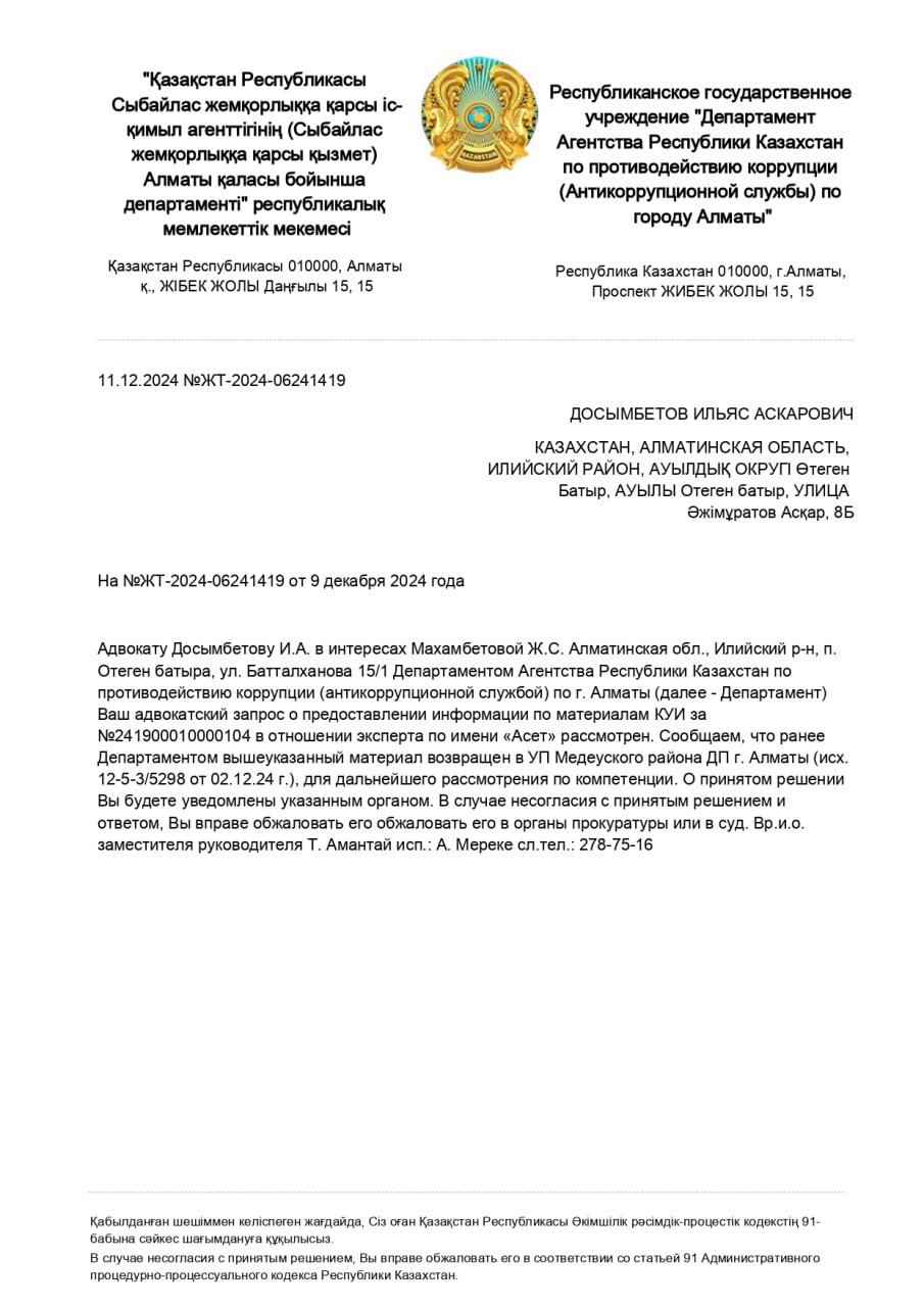 ««Әсет» сарапшыға қатысты № 241900010000104 ҚІЖ материалдары бойынша ақпарат беру туралы сұрауы сараптамадан өтті. Бұдан бұрын Департамент жоғарыда аталған материалды құзыретіне сәйкес одан әрі қарау үшін Алматы қаласы Медеу аудандық полиция басқармасына қайтарғанын хабарлаймыз», деп жауап қайтарған Антикор.