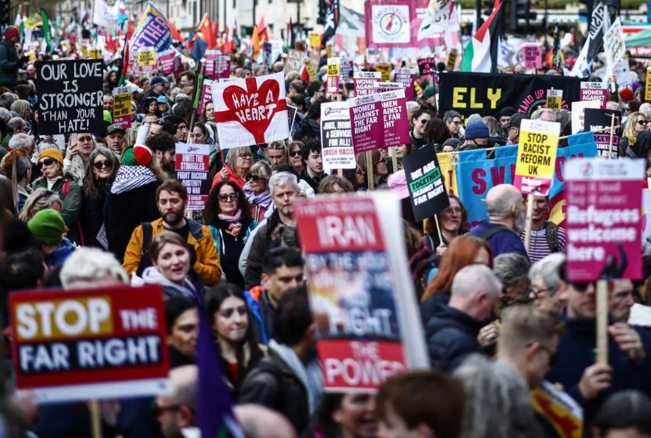 Лондонда да адамдар Ирандағы соғысқа қарсы наразылық білдірді. Көпшілігі «Ультраоңшылдарды тоқтатыңдар» және «Нәсілшілдікке қарсы шығыңдар» деген жазулары бар плакаттар ұстады.