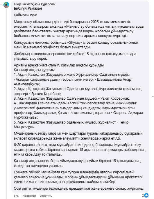 Бұл жазбаға Маңғыстау облысының дін істері басқармасының өкілі Інжу Тұрарова қазылардың кім екенін айта отырып, жауап жазды. Ол ұйымның 15 ақынды ұсынғанын айтқан:
