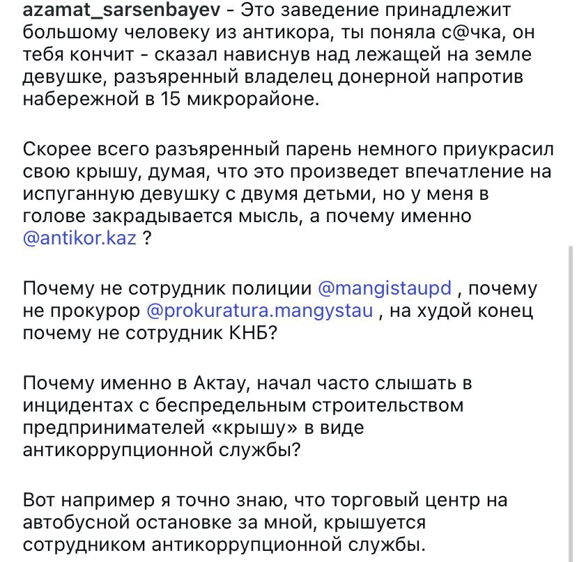 Бұл туралы блогердің өзі әлеуметтік желідегі парақшасында айтты. Азамат Сәрсенбаев Антикордың оны сотқа бергенін мәлімдеді. Оның үстінен 73-3-бап, 2-бөлігі, яғни «көрінеу жалған ақпарат тарату» бойынша әкімшілік іс қозғалды. Блогердің жауапқа тартылуына Instagram-дағы жазбасы себеп болған.