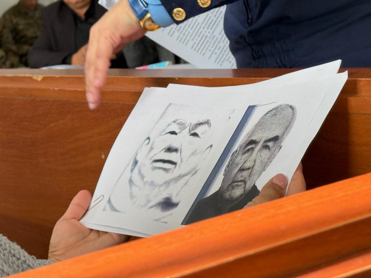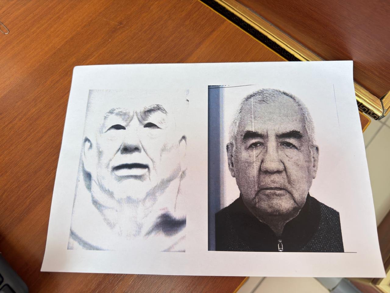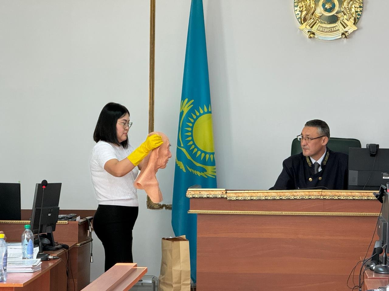 Прокурор силикон бетперденің жәбірленуші Айсағалиге өте ұқсас екенін фотомен салыстыру арқылы көрсетті.