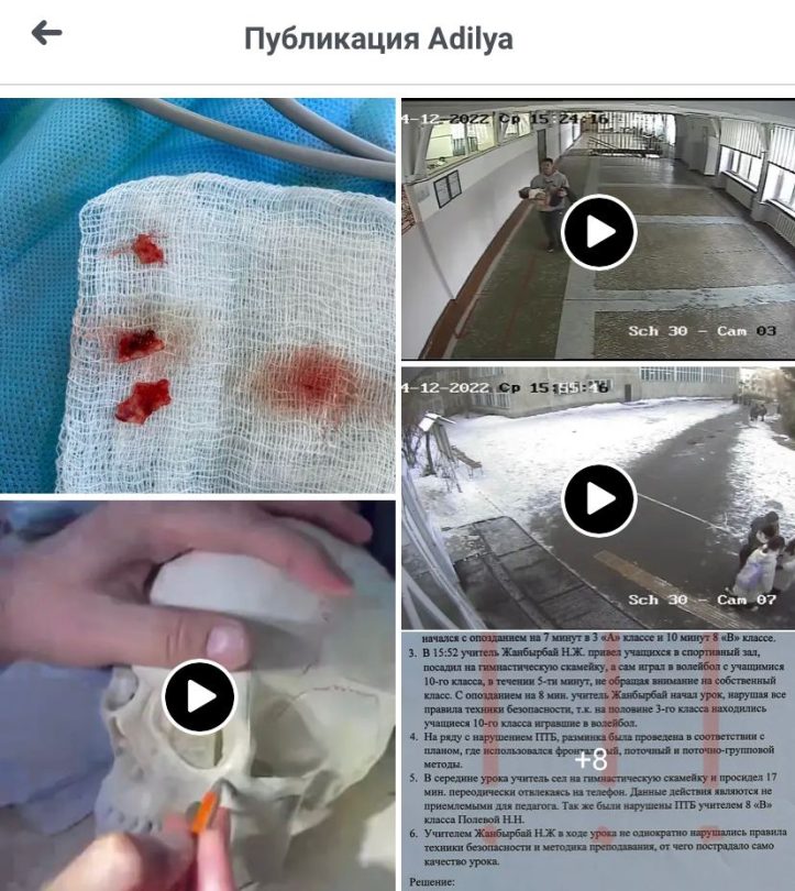 «Сипаттауға сәйкес, мен оның жағдайын ауыр деп қабылдамай, өзім келетінімді айттым, тіпті сыртқа шығуын өтіндім. Оны көргенде бәрі суреттелгеннен әлдеқайда ауыр екенін, мұрнынан қою қан ағып, аяғына әрең тұрып, жүзі бозарып, дірілдеп, ауырғаннан жылап тұрғанын түсіндім. Мұғалім оны киініп, екінші қабаттағы кабинетінің есігінен шығарып салып, тезірек сауығып кетуін тіледі. Есік жабылып, мәселемен жалғыз қалдық. Әрекет ету керек болды, оны анықтауға уақыт болмады» деп жазды әйел әлеуметтік желіде.