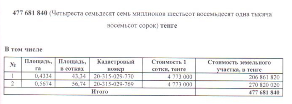 Бұл екі блоктың нарықтық құны 477 млн теңгені құрайды. Яғни, 15 жыл ішінде Самал ықшамауданындағы жердің құны 10 есеге жуық қымбаттады. Азайту бойынша аукцион 358 млн теңгеден басталғанымен, соңында жер телімдері бар болғаны 179 млн теңгеге сатылды. Демек 2,5 есеге арзан сатылып кеткен.