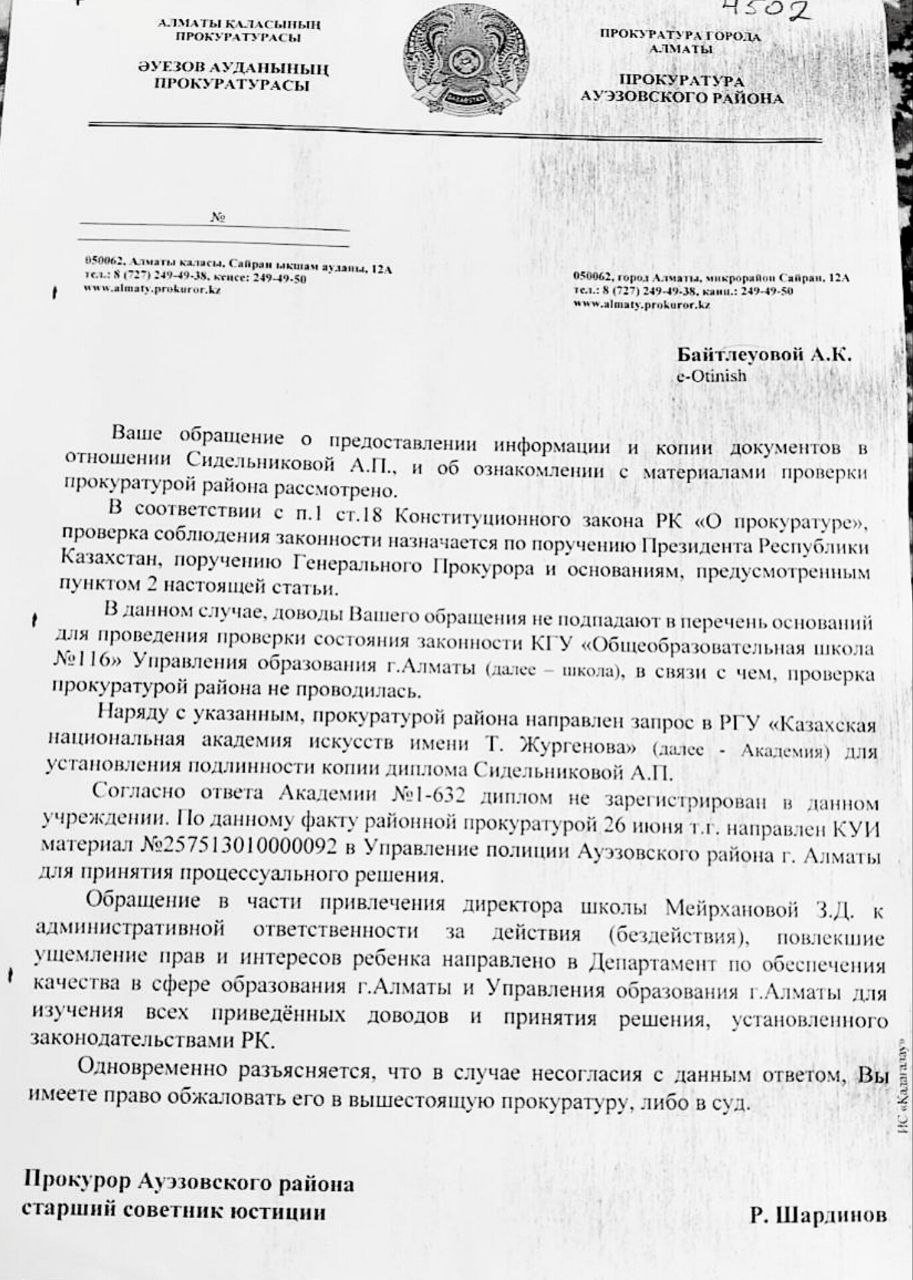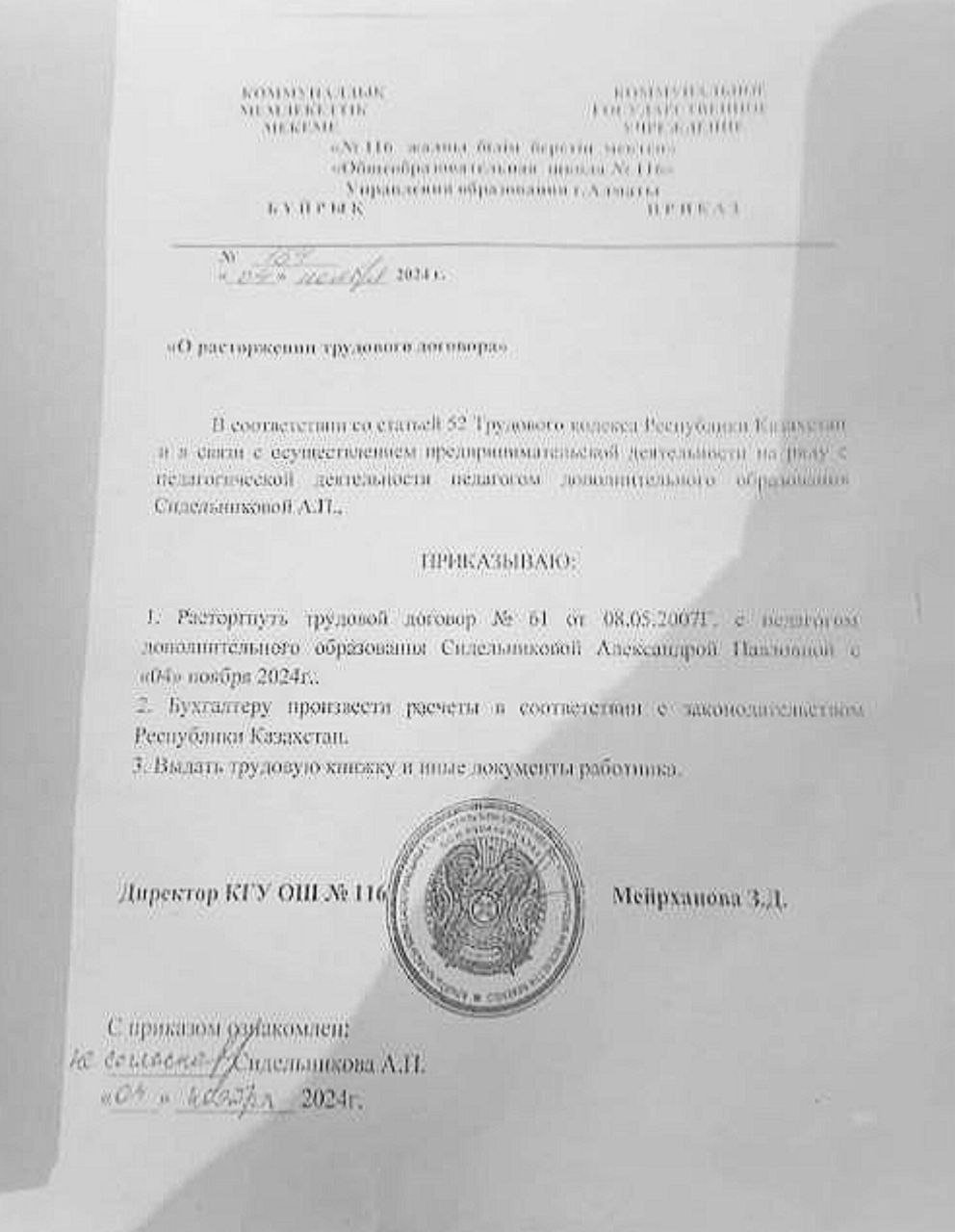 Бұған дейін Александра Сидельникованың Orda тілшісіне оқушы қызға басқа оқушылардың көзінше ауыр сөз айтып, оны мектеп дәлізінде отырғызғаны белгілі болды. Қазір Сидельникова жұмыстан босатылды. Халықтың төлеген ақшасын қалай қайтаратыны әзірге шешілмеген.