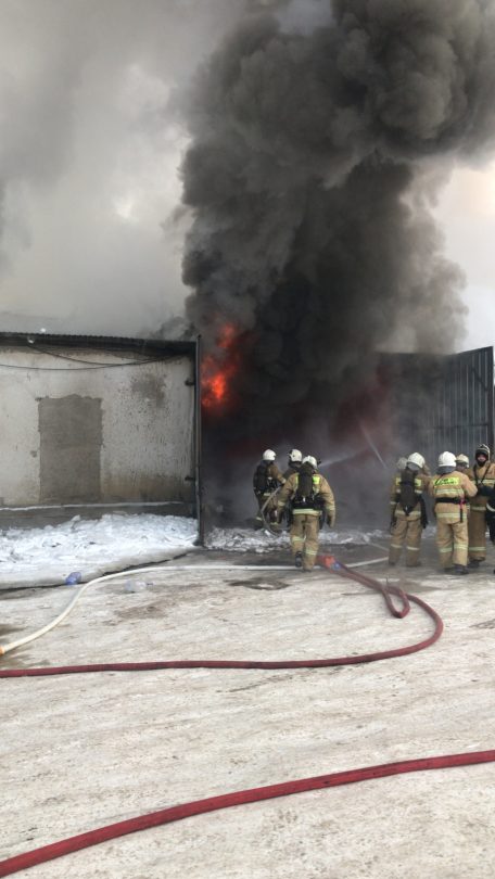 Алматыда тауар-материалдық құндылықтар сақталған қоймалар өртеніп жатыр. Өрт нысандар арқылы тез таралуда. Өрт сөндірушілер шатыр құрылымының опырылғанын хабарлады.