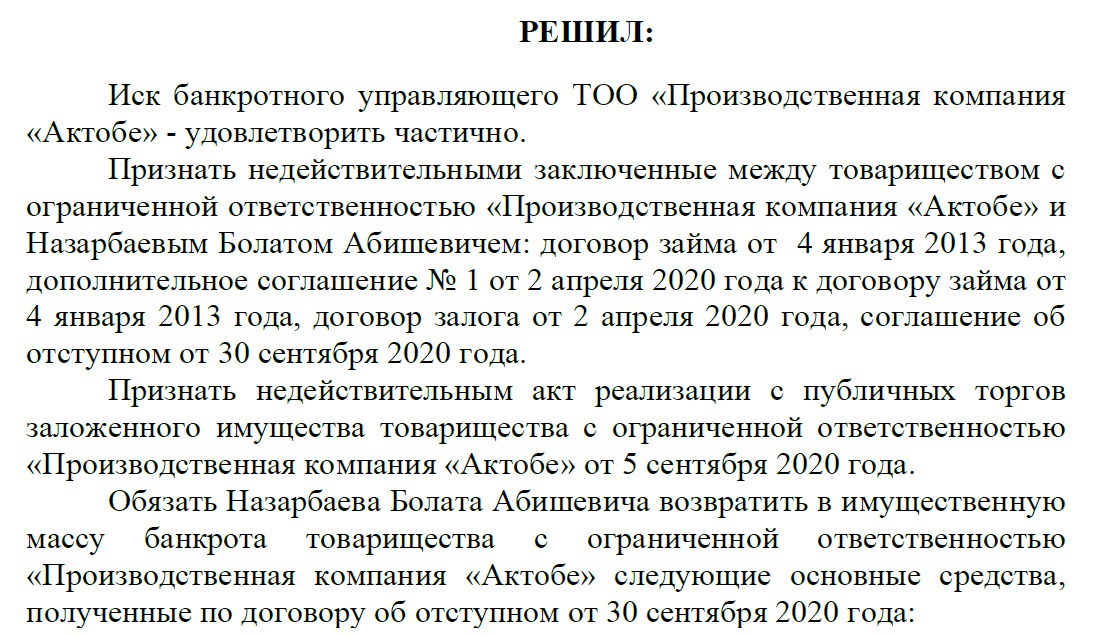 Сот талап арызды ішінара қанағаттандырып, 1,5 млрд теңге несие шартын жарамсыз деп таныды. Кепіл келісімі мен бітімгершілік келісімі де жойылып, Назарбаевтың өзі банкротқа ұшыраған компанияға 448 млн теңге көлеміндегі тыйым салынған мүлікті қайтаруға міндеттелді.