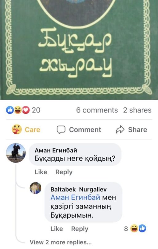 Оған пікір білдірушілер не үшін Бұқар жыраудың суретін қойғанын сұрады. Ал ол «мен қазіргі заманның Бұқарымын» деп жауап берген.