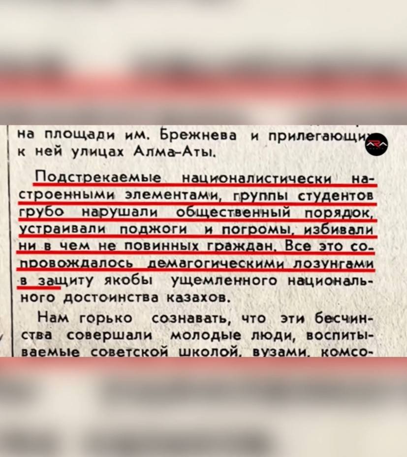 «Ұлтшыл пиғылдағы элементтердің айдап салуымен есірткі мен ішімдікке еліткен жастар қоғамдық тәртіпті өрескел бұзып, өрт қойып, қиратумен айналысты. Еш кінәсіз адамдарды ұрып-соқты» деп жазылған.