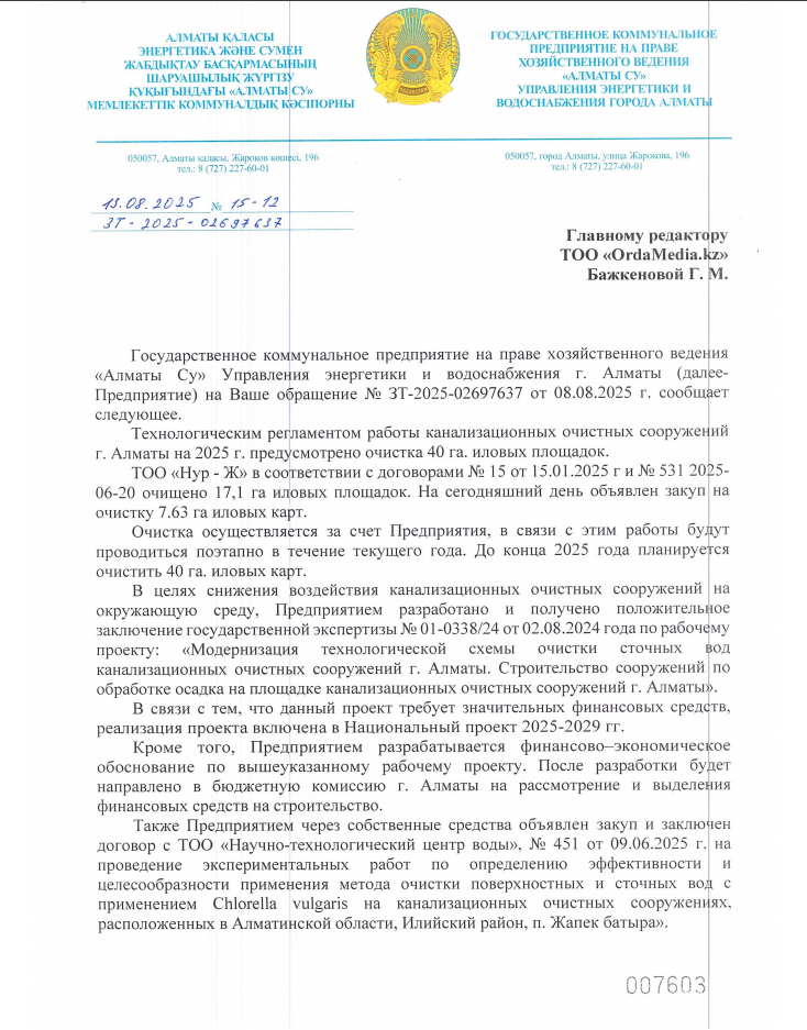 Orda.kz тілшісі жиналыстан кейін «Алматы Су» кәсіпорнына ресми сауал жолдаған болатын. Өз жауабында «Нұр-Ж» ЖШС 17 гектар алаңды тазартқанын және тағы да 7 гектар тазалауға тендер жарияланғанын жазды.