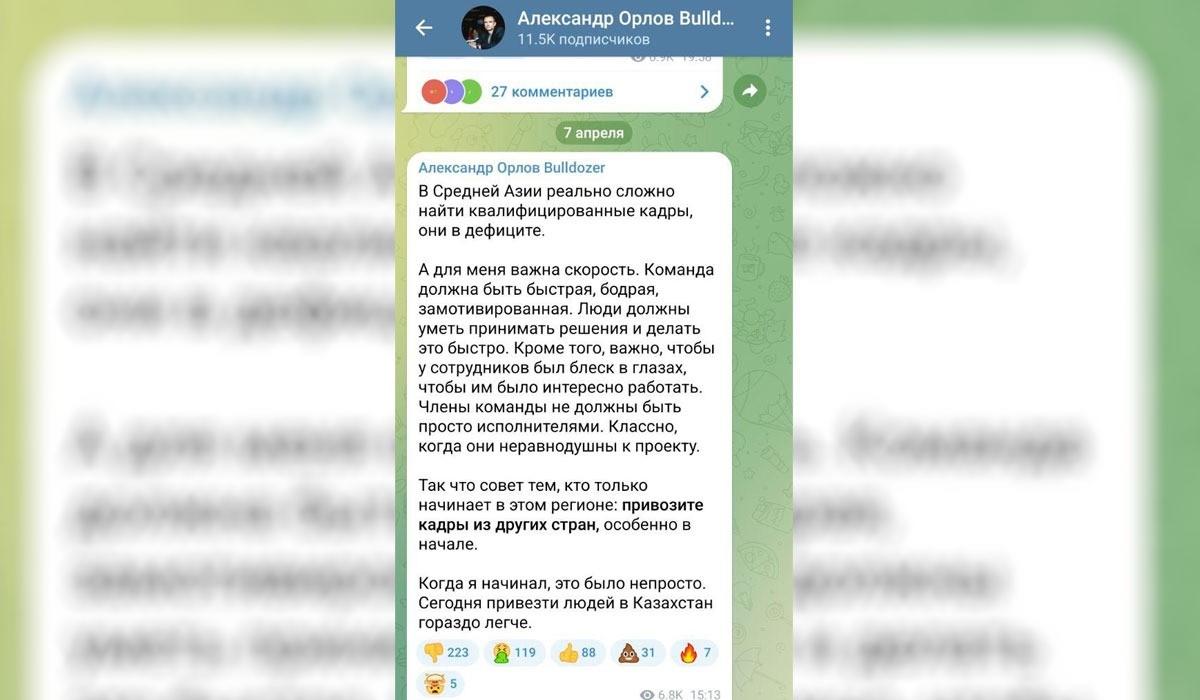 «Біз шетелден келген тамаша адамдармыз, енді сізге, жергілікті тұрғындарға жұмыс істеуді үйретеміз» деген ұстанымы осыдан 20 жыл бұрын ескірген. Енді Орловтың барлық жобалары бір түнде жабылып қалса, Қазақстанның мейрамхана нарығында сапалы құлдырау болмайтыны сөзсіз. Орлов мекемелеріне Қазақстанға ешқандай серпіліс ұсынылмады - бұл басқа мейрамханалар сияқты. Демек, Орловтың жергілікті жердегі жақсы кадрларды таба алмауы – оның кадрмен жұмыс істеуді білмеуінің немесе жай ғана біржақты ұстанымының нәтижесі» дейді Есімханов.