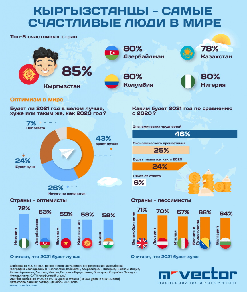 «Қырғызстандықтар - әлемдегі ең бақытты адамдар. Деректер Gallup халықаралық қауымдастығының барлық мүшелері жыл сайын өткізетін танымал халықаралық сауалнама шеңберінде жиналды. Бұл бірлестікте M-Vector компаниясы Қырғызстанның атынан қатысады. Зерттеуді қауымдастық мүшелері өз қаражаттары есебінен жүргізеді және оның нәтижелері ақысыз таратылады, барлығына қол жетімді».
