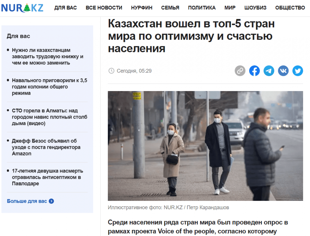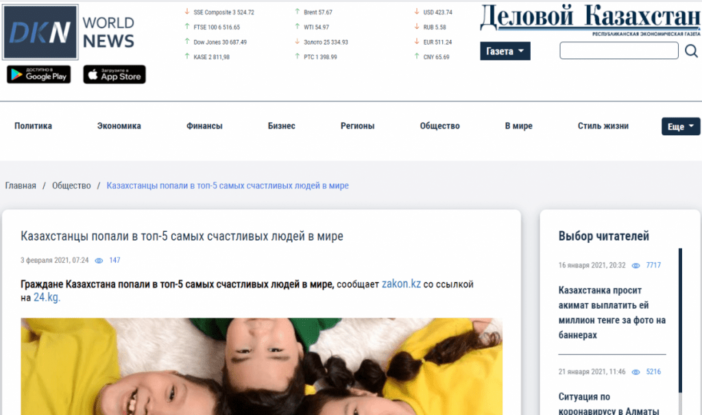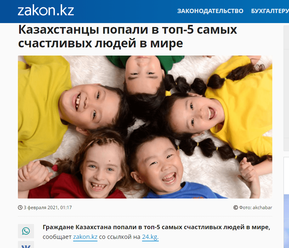 Zakon.kz ақпараттық порталы «Қазақстандықтар әлемдегі ең бақытты адамдардың алғашқы бестігіне кірді» деген тақырыппен жаңалықтар берді.