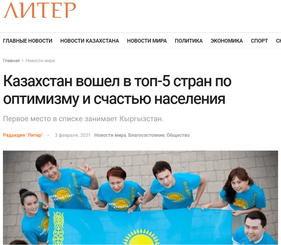 Сәрсенбі, 3 ақпан күні танымал қазақстандық БАҚ «Қазақстан оптимизм мен халықтың бақыты жағынан әлемдегі алғашқы 5 елдің қатарына кірді» деген жаңалық жариялады. ORDA бұл деректердің қаншалықты рас-өтірігін тексерді.