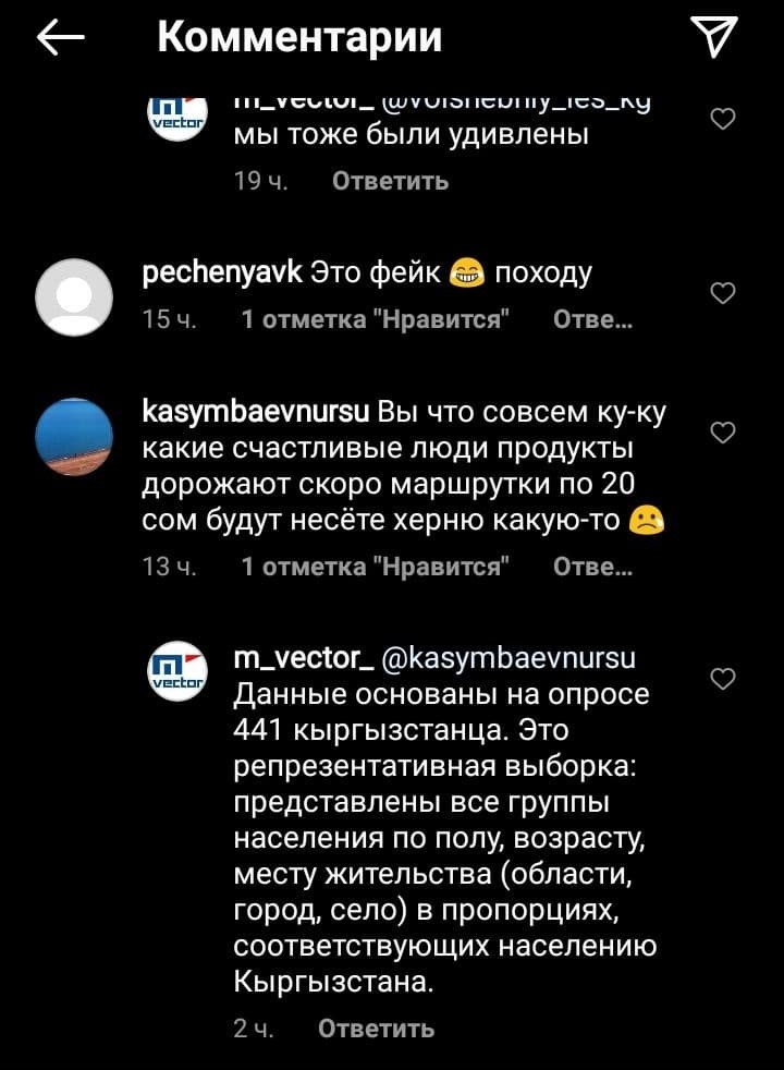 M-Vector ғылыми-зерттеу және консалтингтік компаниясының мәліметтері бойынша, мәліметтер 441 қырғыз азаматының сауалнамасына негізделген. Әлеуметтік желі қолданушылары сауалнама нәтижелеріне күмән келтірді.