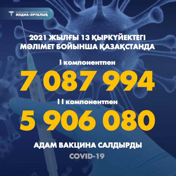 Денсаулық сақтау министрлігінің 13 қыркүйектегі мәліметі бойынша, Қазақстанда I компонентпен 7 087 994 адам вакцина салдырды, II компонентпен 5 906 080 адам.