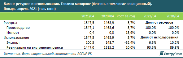 2021 жылғы қаңтар-мамырда елдегі авиациялық бензинді қосқанда 1,9 млн тонна бензин өндірілді, бұл өткен жылмен салыстырғанда 4,6% артық.