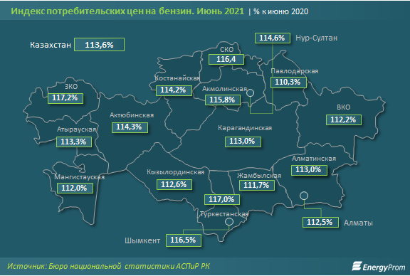 Аймақтық жағдайда Батыс Қазақстан мен Түркістан облыстарының, сондай-ақ Шымкенттің тұрғындары бағаның өсуін бәрінен бұрын сезді - сәйкесінше 17,2%, 17% және 16,5%. АИ-98 - 12,7%, АИ-92 - 13,6%, АИ-95/96 - 14,4% қымбаттады.