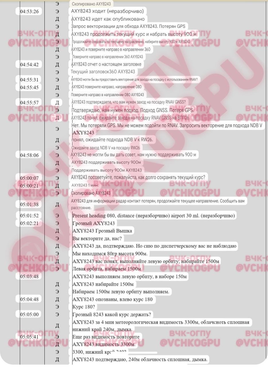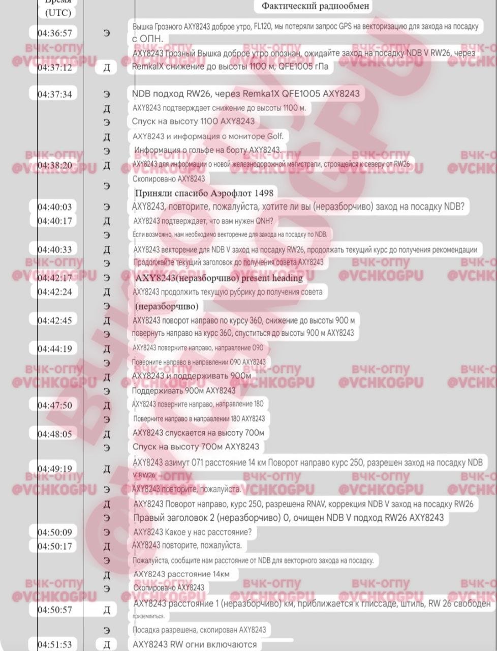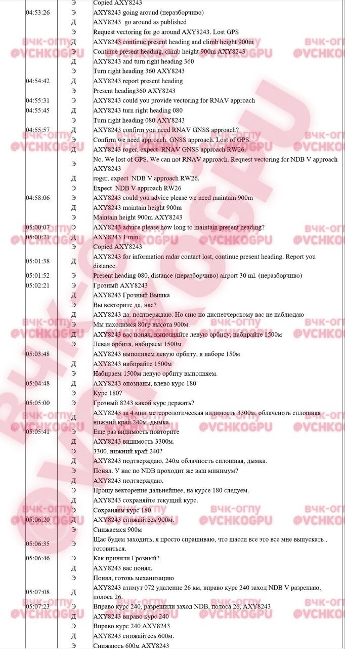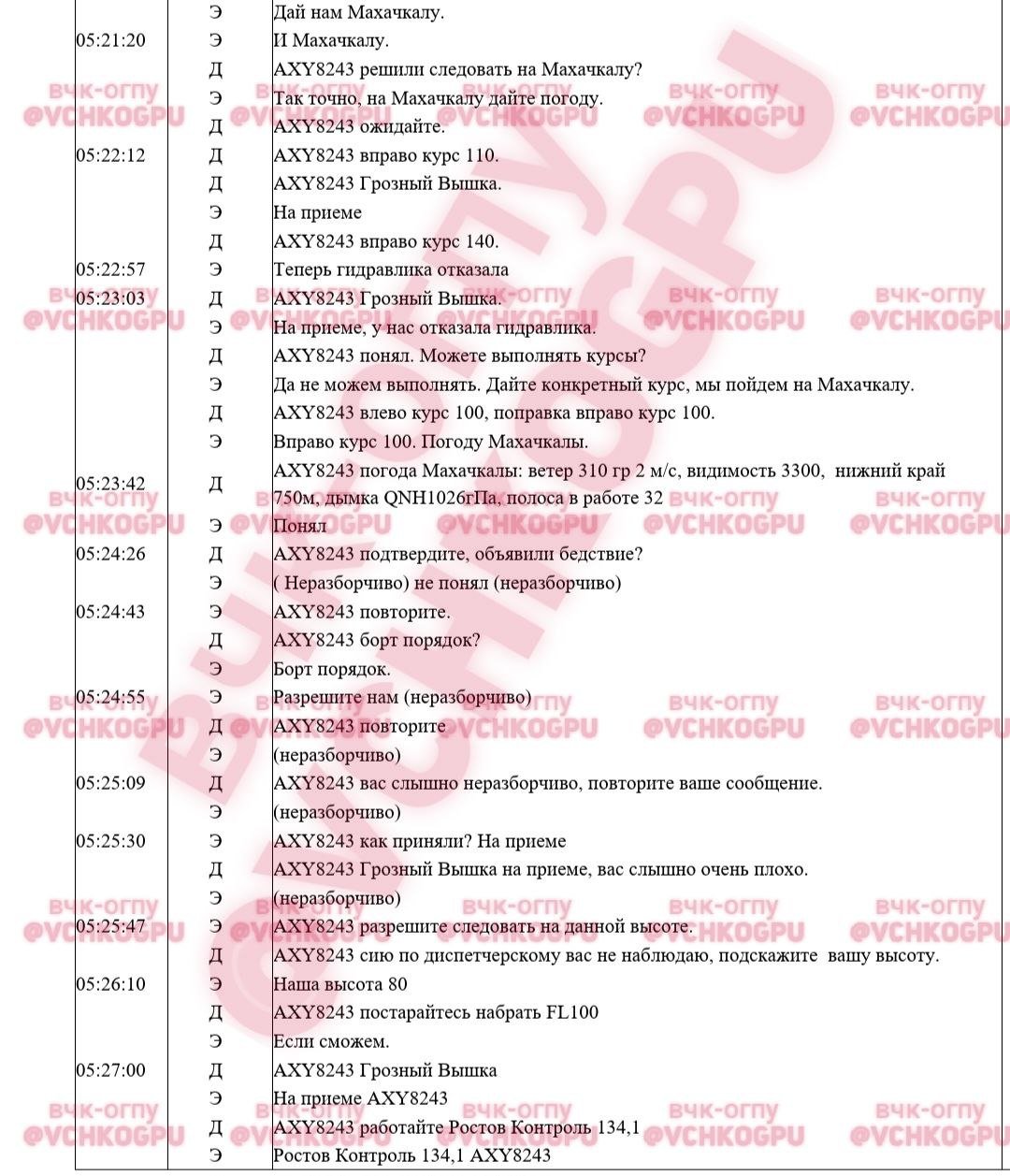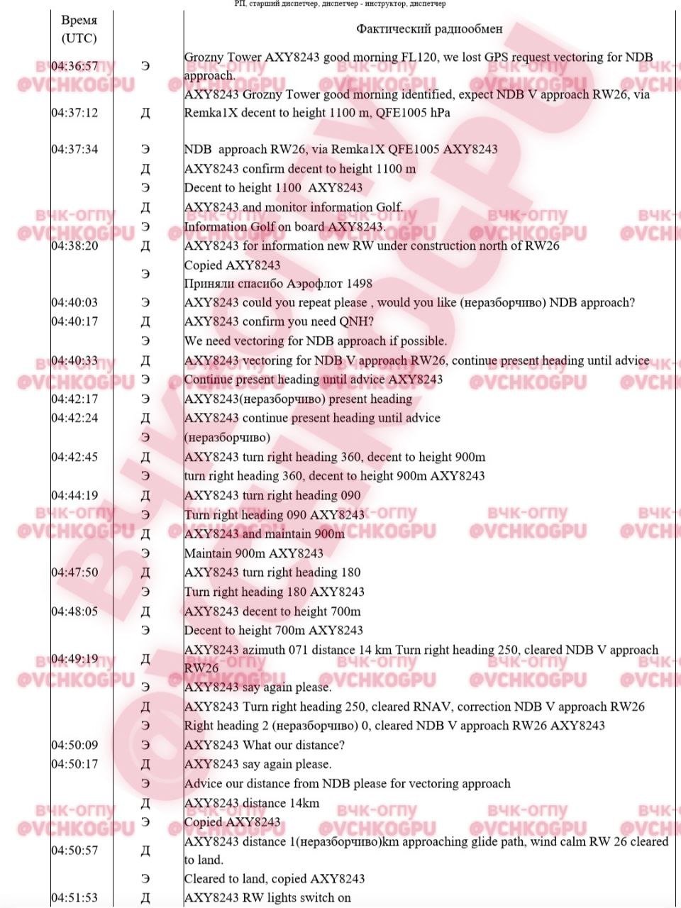 Төменде AZAL ұшағының ұшқыштары мен Грозный диспетчері арасында болған сөздің толық мазмұны ұсынылады.