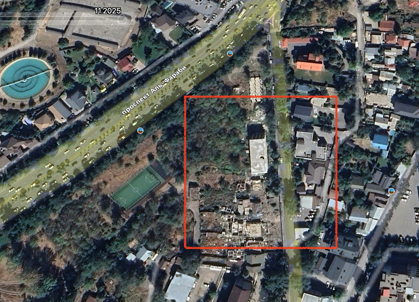 Аты жоқ құрылыстың екінші шеті Әл-Фараби көшесіне барып тіреледі. Ал қоршаудың артқы жағында биік қоршауы бар футбол және баскетбол алаңы орналасқан. Онда мекеменің жігіттері келіп демалып, бос уақытын өткізуі мүмкін деп топшылауға ғана болады. Әйтпесе оның не үшін салынғаны түсініксіз.