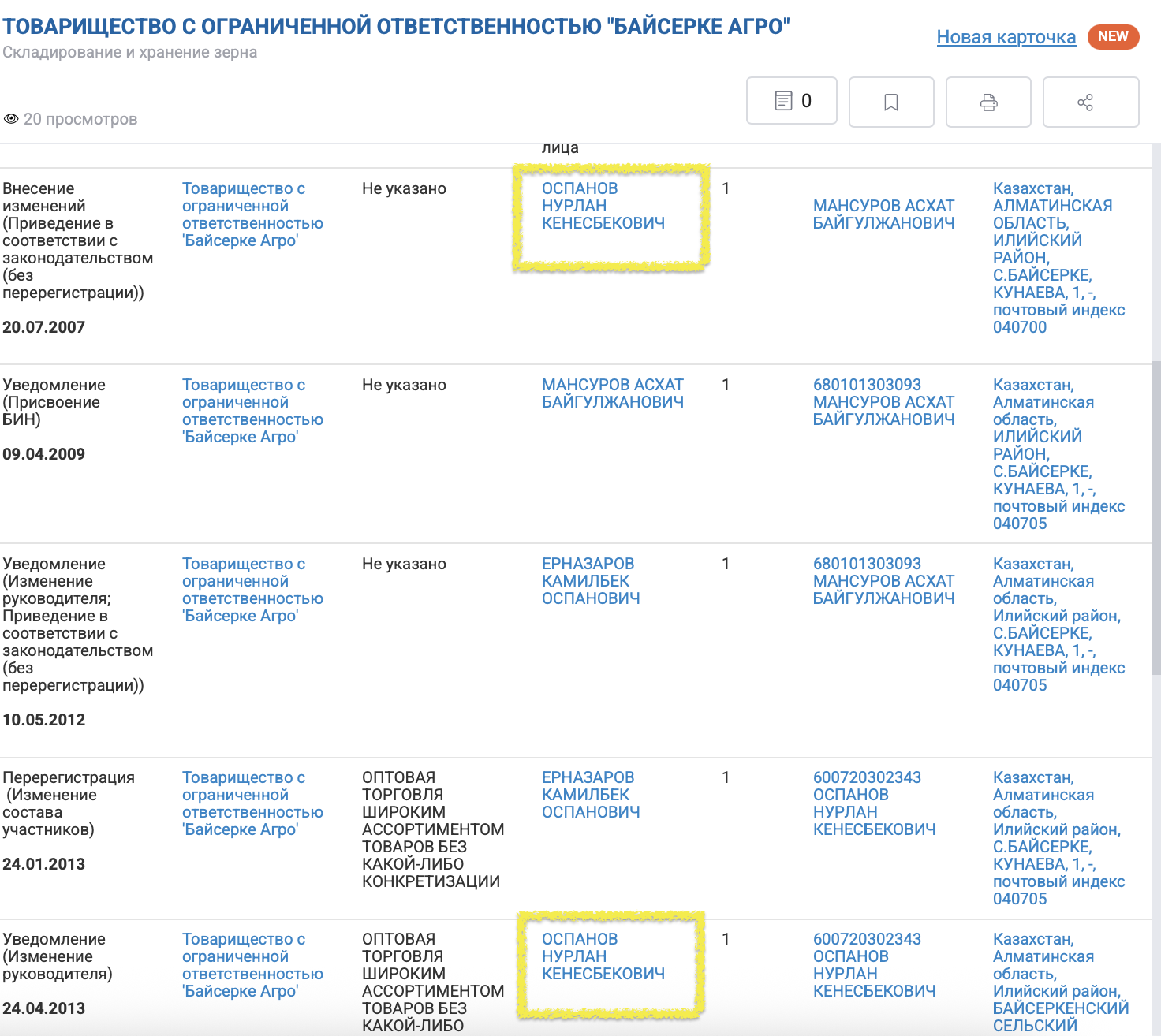 2013 жылы «АгросервисБайсерке и Ко» ЖШС-ын Нұрлан Оспанов басқарды. Оның есімін тағы «Байсерке Агрода» компаниясына қатысты мәліметтерден де байқап қалдық.
