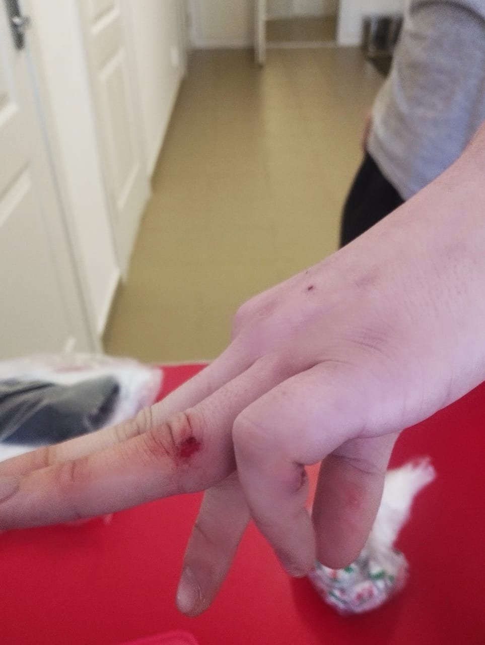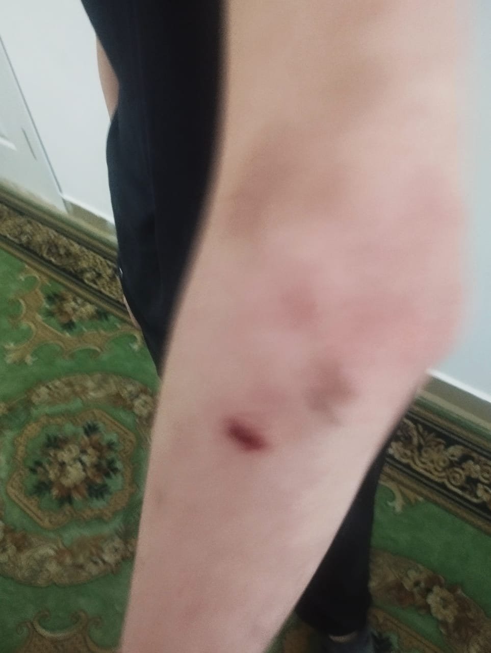 Әкесінің айтуынша, қашқаннан кейін ол ұлын көруге инспектор Айгүл Кәрімовамен бірге барған. Полиция қызметкері жалғыз өзі кіріп, баланы көрген. Бірақ карантин деп, әкесін ішке кіргізбеген. Сол кезде Айгүл Кәрімова баланың денесінде бұрын алған жарақаттарымен қатар көгерген жерлері бар екенін хабарлаған. Анасының сөзіне сенсек, ұлын жедел жәрдем көлігінің ішінде бес медицина қызметкері ұрып-соққан. Бұл жайтты оның Максим деген көршісі көргенін айтып, жазбаша арыз жазған.