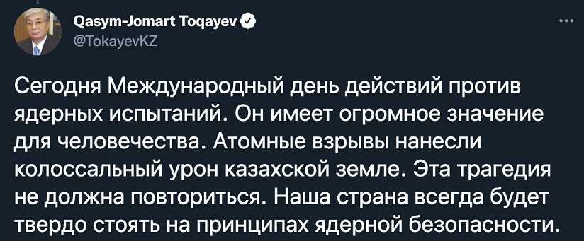 Қасым-Жомарт Тоқаев Twitter парақшасында Халықаралық ядролық сынақтарға қарсы іс-қимыл күнін еске салды.