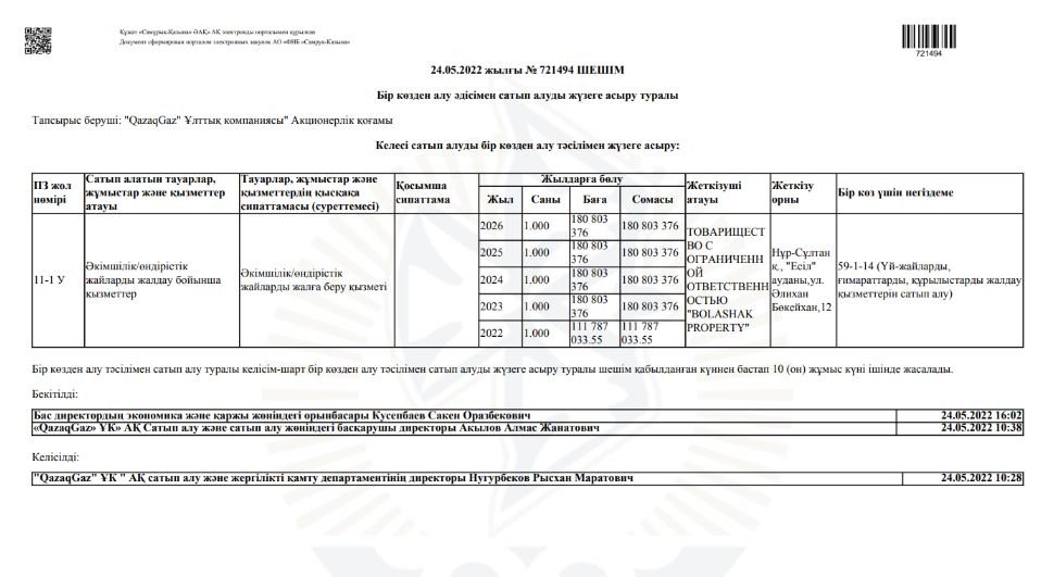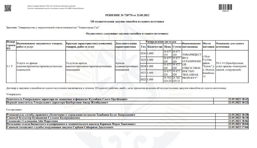 2022 жылдың 24 мамырындағы № 721494 шешімі бойынша, ұлттық компания екі жылдан кейін сол ғимаратты үш жарым есе арзан жалға алады.