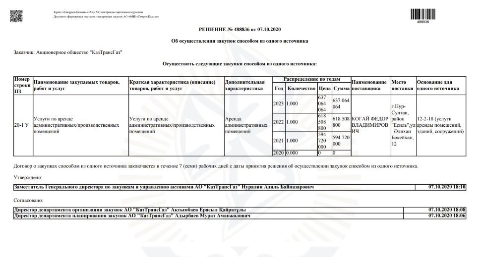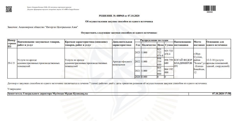 2022 жылғы 24 мамырдағы №721524 шешімі. Бұл шешім бойынша, АО «Интергаз Орталық Азия» жылына миллиард теңге төлейтіні жоспарланған ғимаратты, шын мәнінде, 180 миллион теңгеге, яғни алты есе арзанға жалға алуға болатыны анықталды.