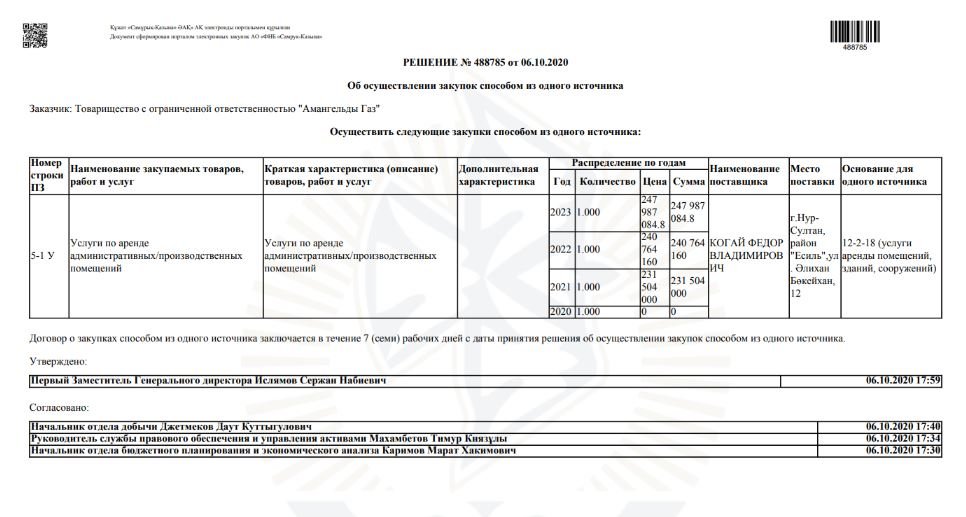 «Амангелді Газ» ЖШС 2020 жылдың 6 қазанындағы № 488785 шешімі бойынша үш жыл ішінде Шәріпбаевтың компаниясына шамамен миллиард теңге төлейтін болған.