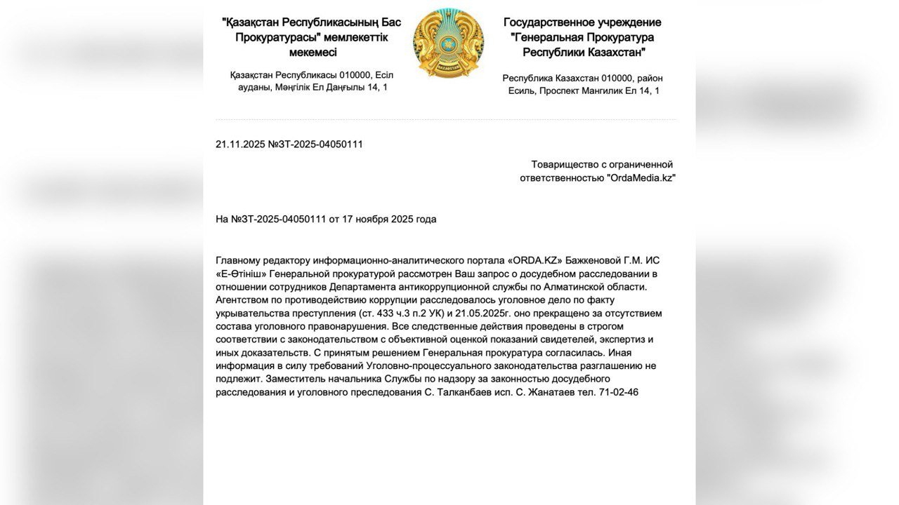 Orda.kz бас прокуратураға, Ішкі істер министрлігіне және Антикорға (қазір ҰҚК құрамында) ресми сауал жолдады. Сауал осы Антикордың үш қызметкері күдікті деп танылған істің барысына қатысты қойылды.
