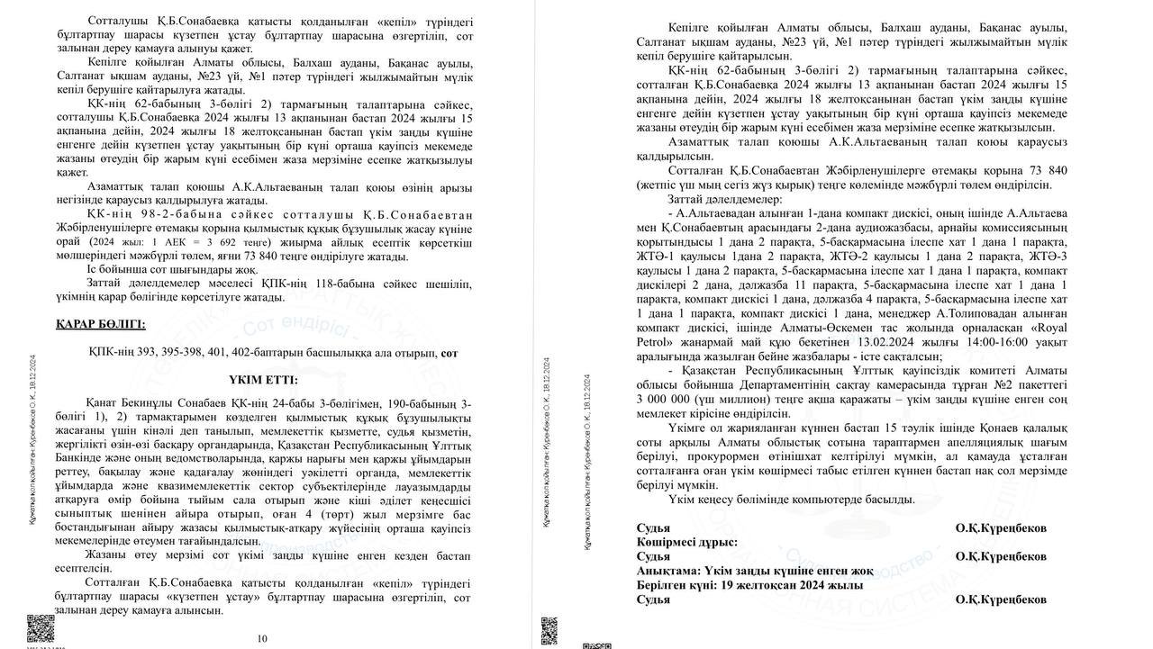 «Мен прокурор Қанат Сонабаевпен сөйлескен кезде мен оған беретін 12 млн ақшамның жоқ екенін айттым. Содан ол маған қанша бере алатынымды сұрады, мен 5 млн бере аламын деп айттым. Ол бірден келісті. Мен ендеше ақша тапқан кезде өзім хабарласамын деп кабинетінен шығып кеттім», – деді Әлтаева.