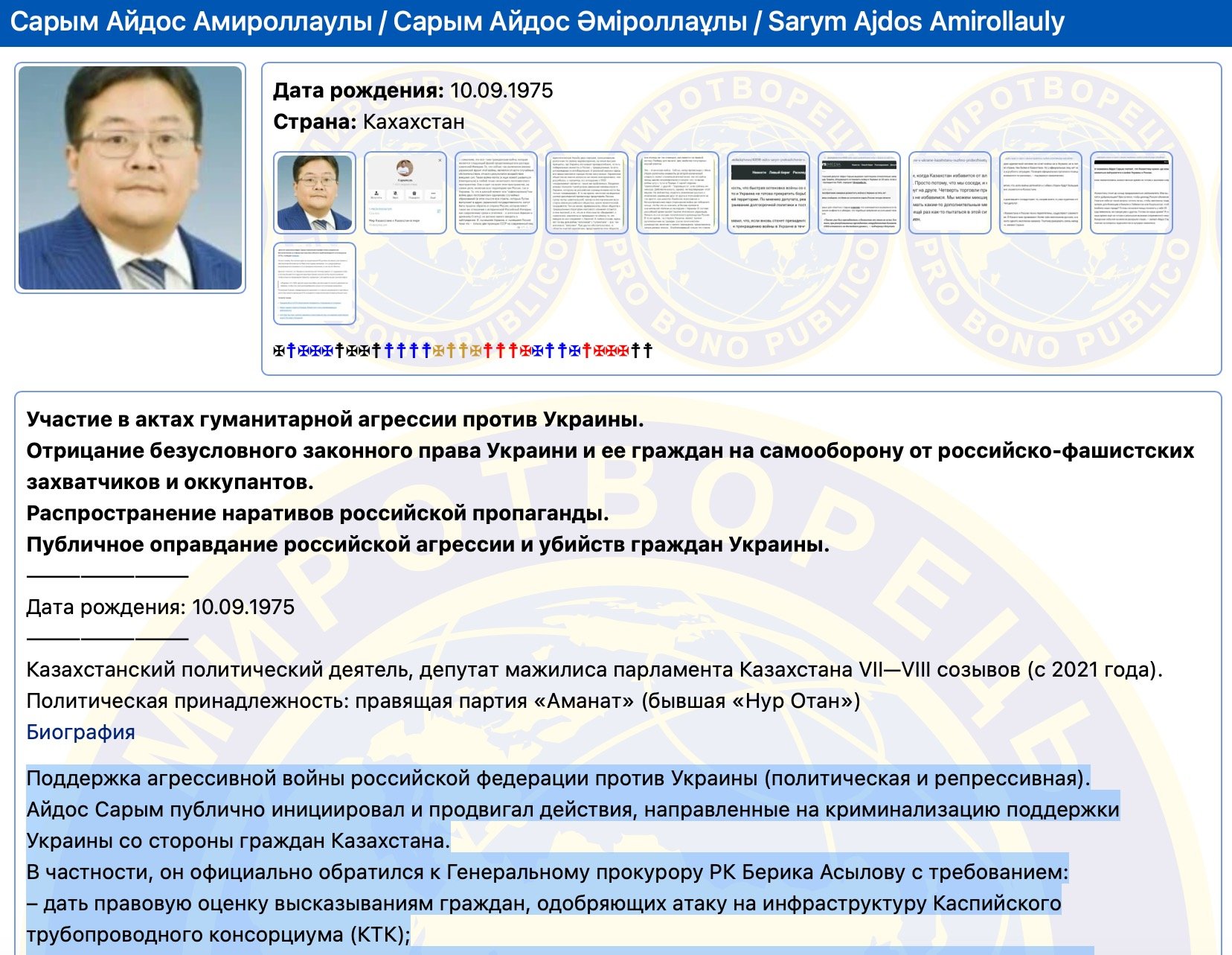Аталған тізімде Айдос Сарымның Ресей Федерациясының Украинаға қарсы соғысына қолдау көрсеткені және Қазақстан азаматтарының Украинаға қолдау білдіру әрекеттерін қылмыстық сипатқа айналдыруға бағытталған іс-шараларды насихаттағаны көрсетілген, деп хабарлайды Orda.kz.
