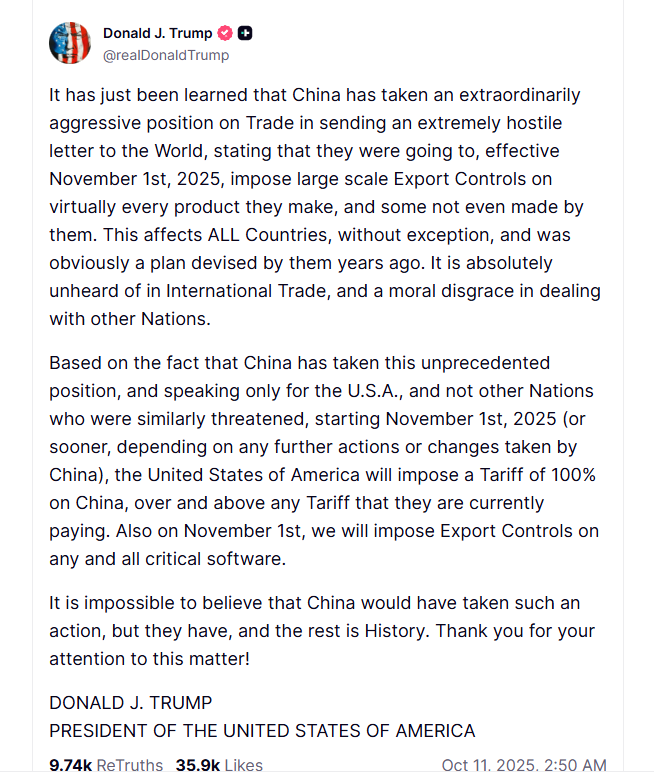 АҚШ президенті Қытай Халық Республикасының алдағы әрекеттеріне байланысты, 1 қарашадан бастап (немесе одан бұрын) қазіргі қолданыстағы салықтарға қосымша 100% баж салығын енгізетінін жариялады, деп хабарлайды Orda.kz.