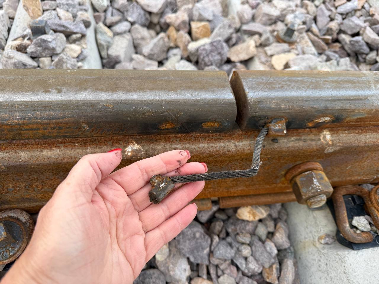 Рельстердің үсті шашылып жатқан тастар мен бос сымдарға толы. Кей жерлерде темірлер дәнекерленбей қалған. Кейін мамандар оның рельстік тізбектің электрлік қосындысы, яғни пойыз қозғалысын реттейтін сигнал беру және автоблоктау жүйесінің бөлігі екенін түсіндірді. Онсыз пойызды соқыр деуге болады.