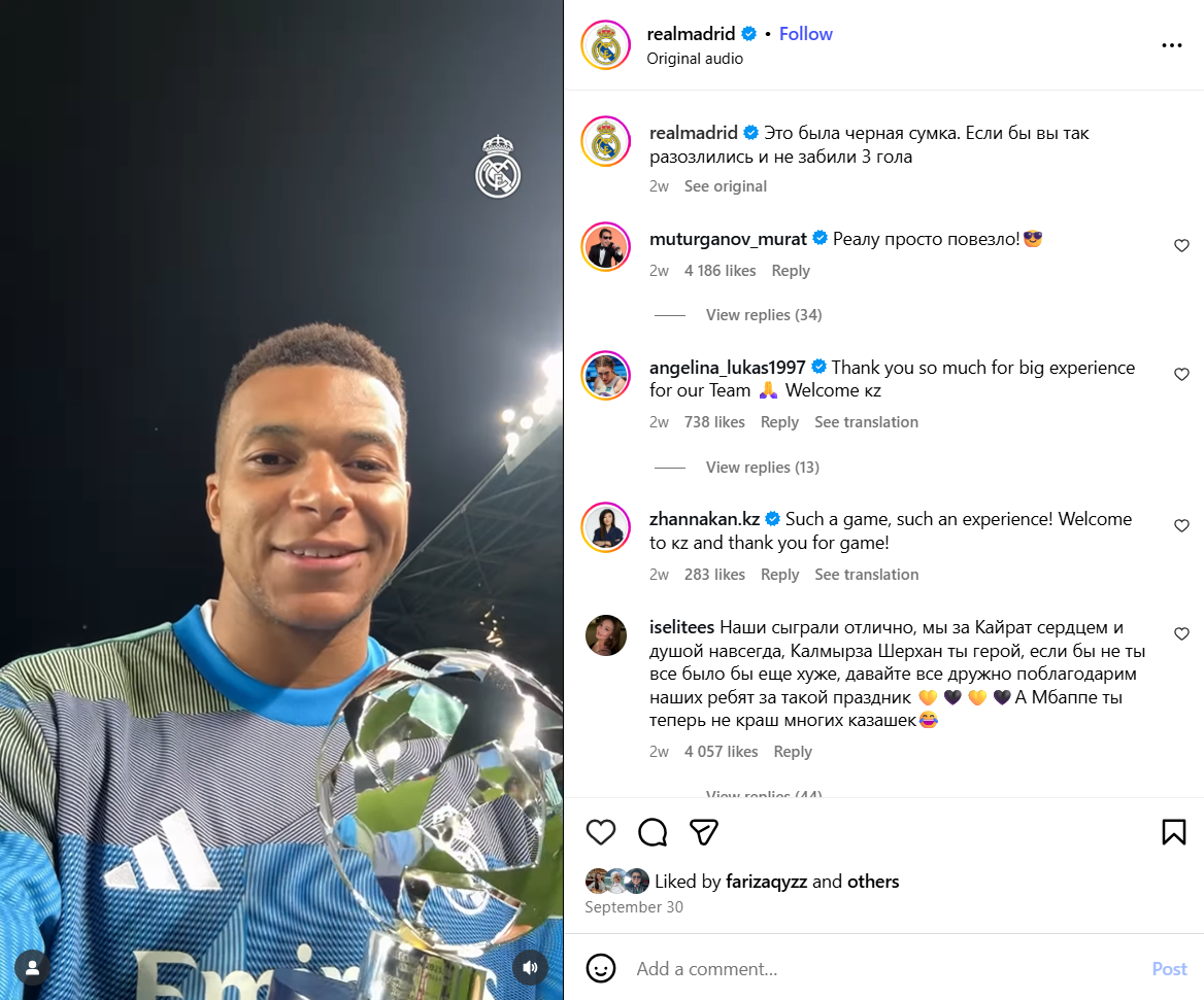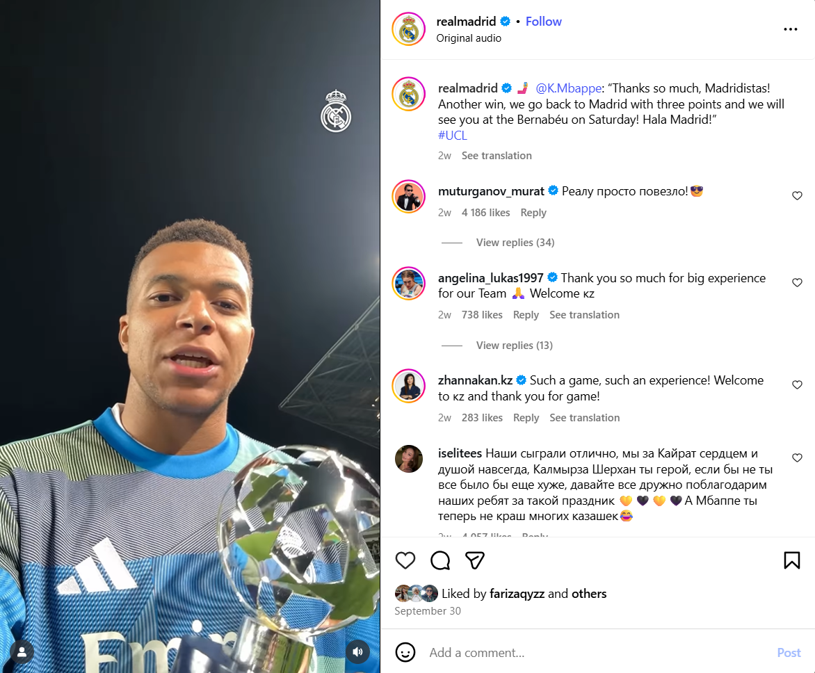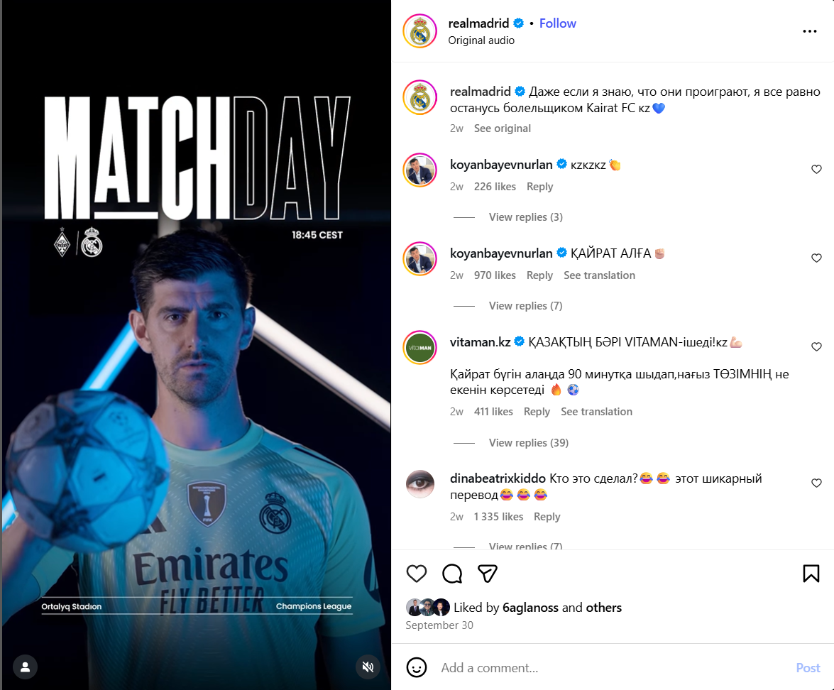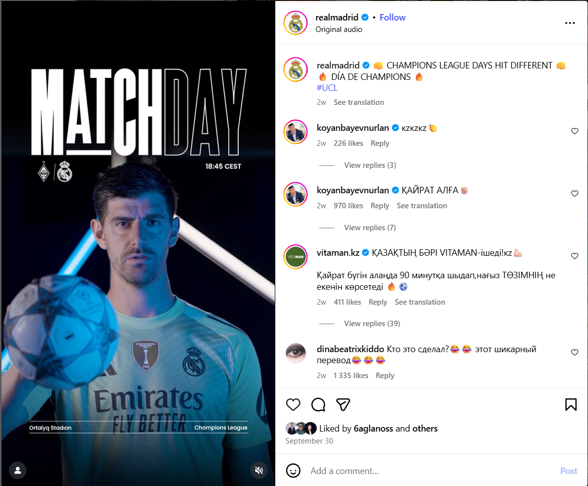 30 қыркүйек күні алматылық «Қайрат» чемпиондар лигасы аясында өз алаңында испаниялық клуб «Реал Мадридті» қабылдап, ойын 0:5 есебімен аяқталған болатын. Осы тұста тағы да Meta AI Испаниядан келген клубтың ресми парақшасының жазбаларын басқаша аударып, қазақстандықтардың назарын аудартты.
