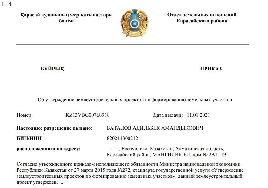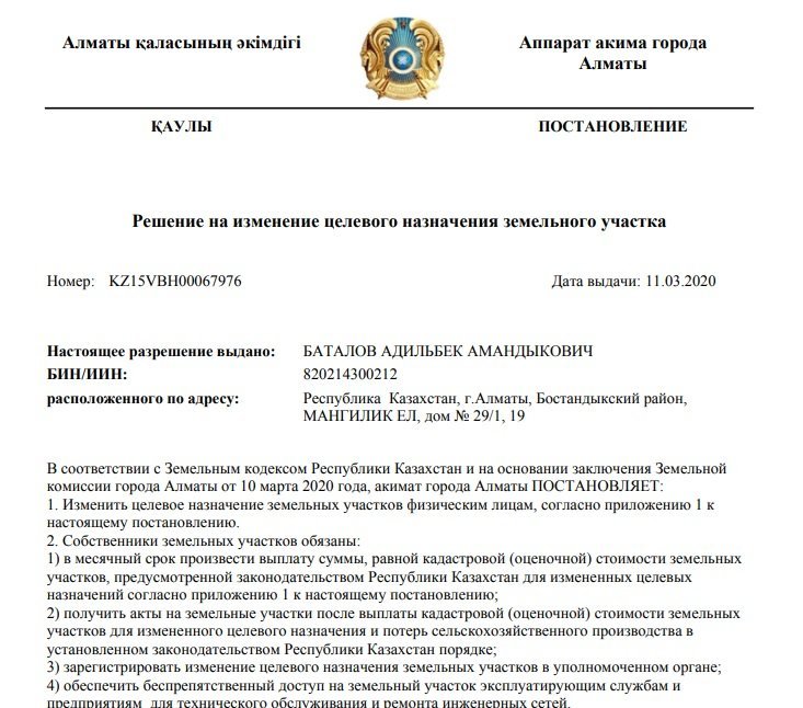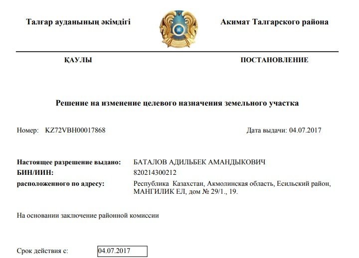 Мәселен, Талғар ауданының әкімдігі осы ЖК атына жер телімінің нысаналы мақсатын өзгертуге рұқсат берген. Құжатта Баталовтың мекенжайы Ақмола облысы, Есіл ауданы, Мәңгілік Ел көшесі, 29/1 үй деп көрсетілген. Алайда мұндай мекенжай бұл өңірде жоқ, тек Астанада осыған ұқсас орын бар.