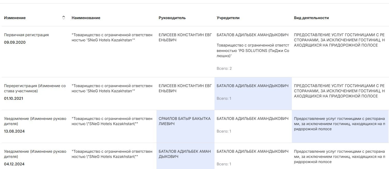 Компанияның нақты қызметін таба алмадық. Бірақ қызық сәйкестік кездесті: S.N.e.G Hotel & Restaurant қонақүй кешені бар. Бұл мейрамхана кезінде бизнесмен Алмас Абдығаппаровтың негізгі активтерінің бірі болған Parmigiano Group құрамына кірген. Алайда ол нысан 2024 жылғы наурызда жұмысын тоқтатты. Мүмкін, атауы жай ғана сәйкес келген шығар. Бірақ шын мәнінде Алмас пен Әділбек басқа жобаларда да бас қосқанын ескерген жөн.