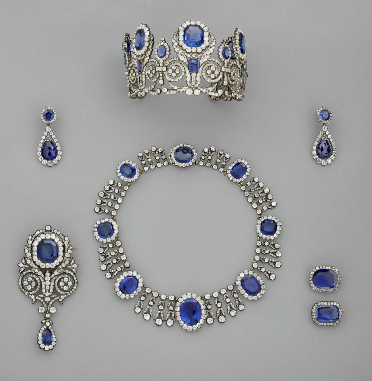 - Мари-Амелия мен Гортензия патшайымдарға тиесілі жақұт орнатқан тәж (тиара), алқа және сырға;