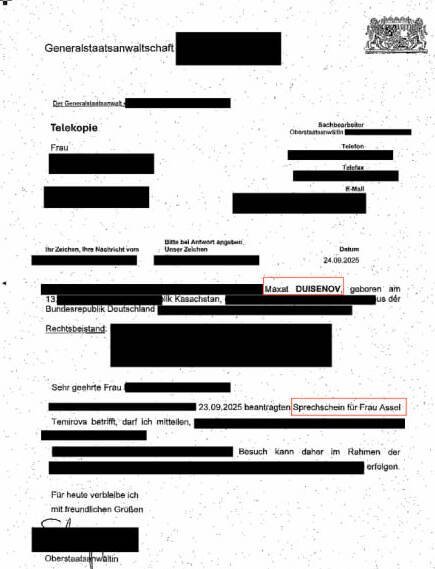 «Сапардың мақсатын ашып айта алмаймын. Ол халықаралық жемқорлыққа қарсы тергеулер үшін құнды мәліметтерге қатысты. Біз Дүйсеновтің қатысы бар маңызды ақпараттары бар деп санаймыз», — дей келе ол неміс прокурорынан келген хатты қоса жіберді.