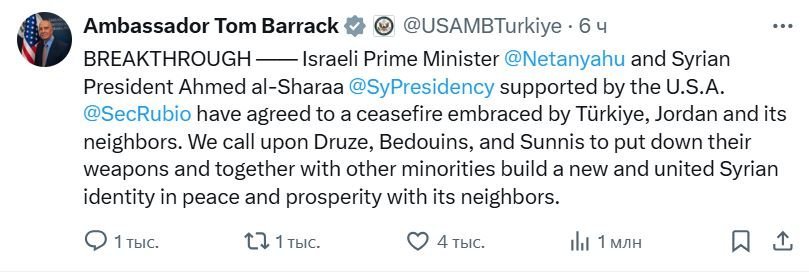 «СЕРПІЛІС - Израиль премьер-министрі Биньямин Нетаньяху мен Сирия президенті Ахмед әл-Шараа (@ SyPresidency) АҚШ-тың қолдауымен Түркия, Иордания және көрші мемлекеттер қарсы алған атысты тоқтатуға келісті. Біз достарды, бедуиндер мен сунниттерді қаруды тастап, басқа азшылықтармен бірге көршілермен бейбітшілік пен гүлденуде жаңа және біртұтас сириялық бірегейлік құруға шақырамыз» деп жазды Томас Баррак.