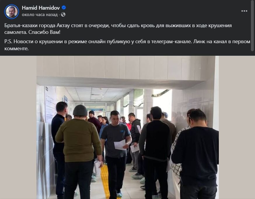 Әзірбайжандық журналист Хамид Хамидов ұшақ апатынан аман қалған жолаушыларға қан беруге асыққан қазақстандықтарға өзінің парақшасында алғыс айтты.