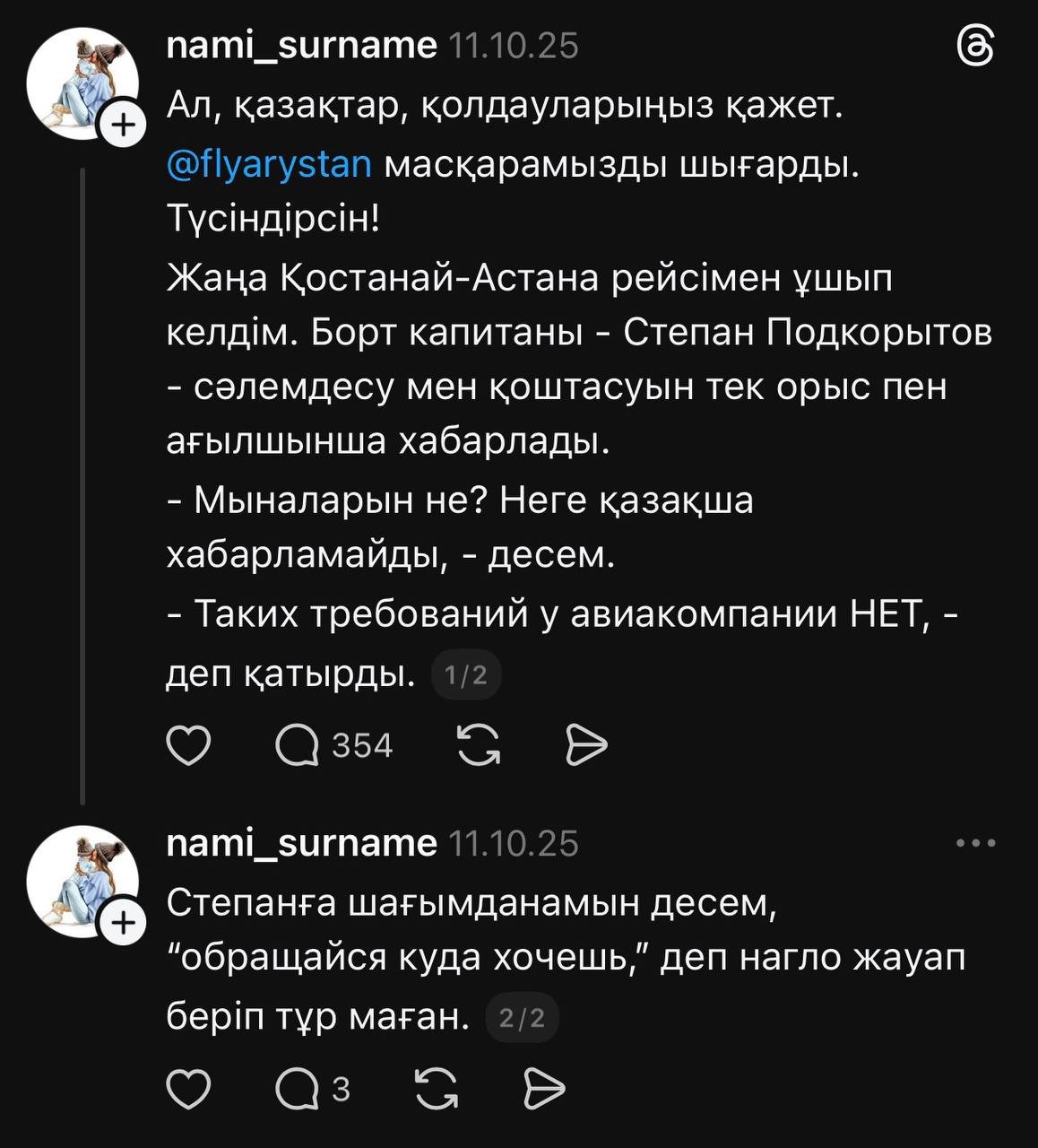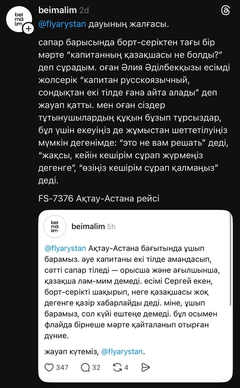 «Қостанай–Астана рейсімен ұшып келдім. Борт капитаны Степан Подкрытов амандасу мен қоштасуды қазақша айтқан жоқ. «Неге қазақша хабарландыру жоқ?» деп сұрағанда, жолсерік «авиакомпанияда ондай талап жоқ» деп жауап берді», – деп жазды ол.