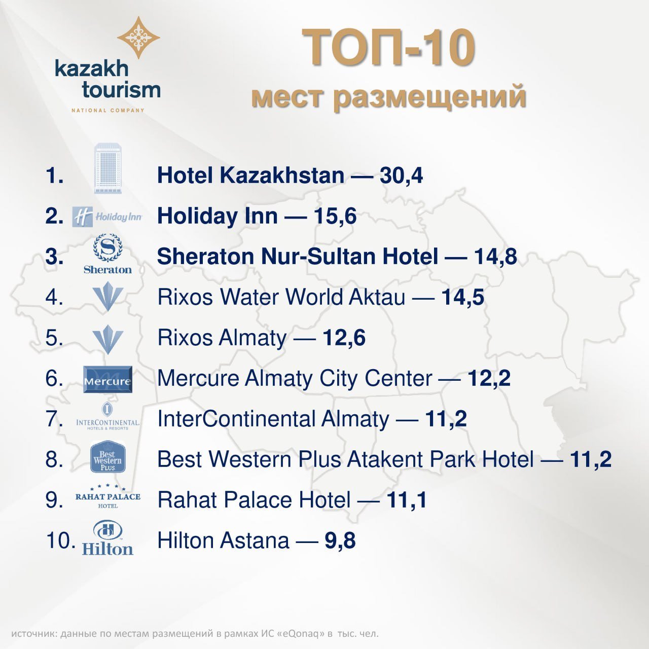 Kazakh Tourism Қазақстандағы қонақ үйлердің туристер арасында танымалдығы бойынша рейтинг жариялады. Бірінші және екінші орындарды Алматы қаласындағы «Қазақстан» және Holiday Inn қонақ үйлері иеленді. Үшінші орынға астаналық Sheraton Nur-Sultan Hotel орналасты.