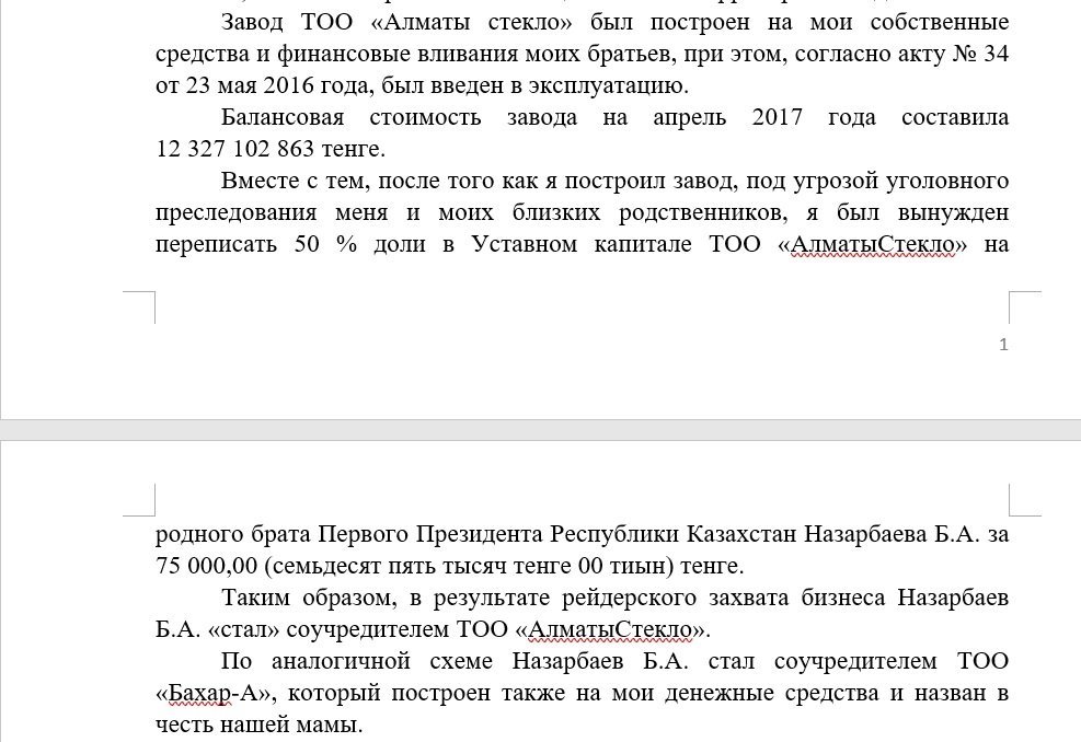 Хатында Абдуллаев Болат Назарбаевтың адамдарымен тек «Алматы әйнек» зауытының 50 пайыздық үлесін ғана емес, 2009 жылы құрылған «Шалқар 17» және 2013 жылы құрылған «Бахар-А» компанияларының үлестерін де иемденгенін жазған. Ол «Шалқар 17»-ге қарулы арнайы жасақ келгенін атап өткен.