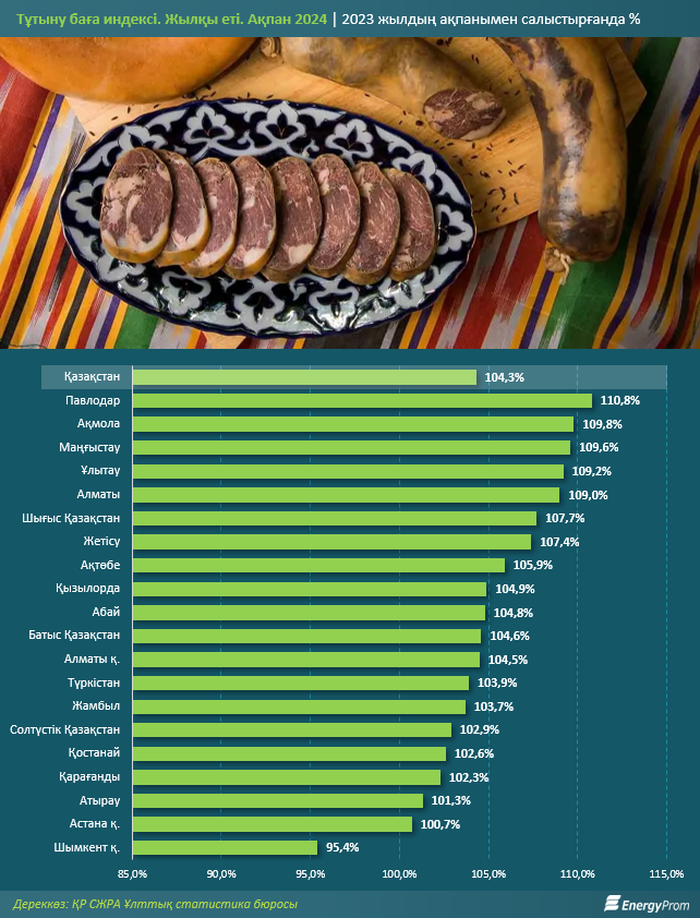 Жылқы еті ең көп Павлодар облысында қымбаттады — бір жылда 10,8%-ға. Одан кейін Ақмола (9,8%) және Маңғыстау (9,6%) облыстарында.